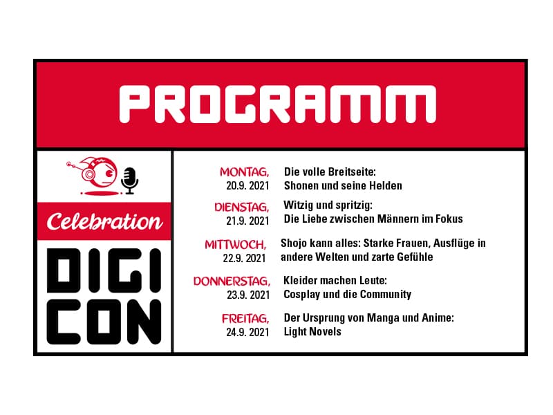 Bei der TOKYOPOP Celebration DIGI CON handelt es sich im Prinzip um eine digitale Messe, die auf Podcast-Panels basiert und die der Verlag zwischen dem 20. und 24. September 2021 auf seiner Webseite tokyopop.de stattfinden lassen möchte. Dabei dürfen sich Fans auf Panels zu unterschiedlichsten Themen aus der Manga- und Animewelt freuen, bei denen auch Experten aus der Branche als Gastsprecher mit von der Partie sein werden.