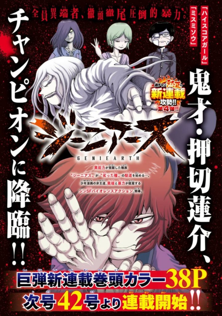 Der neue Titel „Geniearth“ von Rensuke Oshikiri wird demnach am 16. September mit der 42. Ausgabe der „Weekly Shonen Champion“ starten. Es handelt sich dabei um einen Action-Science-Fiction-Manga, in welchem der sogenannte „Geniearth“ übernatürliche Kräfte besitzt und die in seinen Augen niederen Spezies vernichten möchte, um das Land zu erobern.