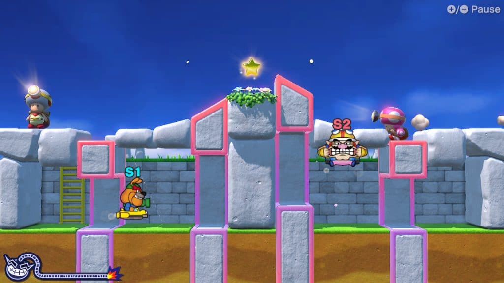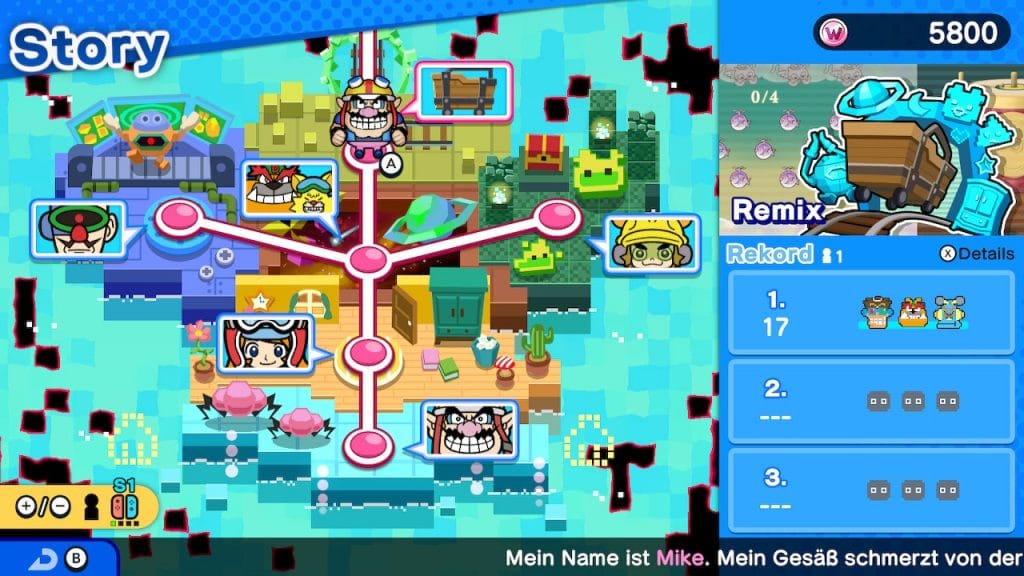 Die Story ist in eine Art kleine Cartoon-Serie verpackt. Vor jedem Level startet eine kleine Sequenz, in der ihr das Problem erfahrt und etwas von der Handlung mitbekommt. Das ist eigentlich ganz nett gemacht und fühlt sich manchmal wie das Anschauen einer Kinderserie an. Leider ist die Story nicht wirklich spannend verpackt. Es werden lediglich verschiedene Welten dargestellt, welche mit Mikrospielen vollgepackt sind. In einem Levelabschnitt müsst ihr eine bestimmte Anzahl von Mikrospielen (meistens 15) absolvieren. Teilweise lassen sich dabei bestimmte Themen oder Muster erkennen. In einem Level gab es tolle Referenzen zu anderen Nintendo-Spielen, was das Level spannend gemacht hat. Habt ihr das Level geschafft, kommt ihr in einen neuen Bereich der Spielwelt. Letztendlich lernt ihr im Story-Modus die volle Bandbreite an Mikrospielen kennen, die ihr in dem Spiel spielen könnt.