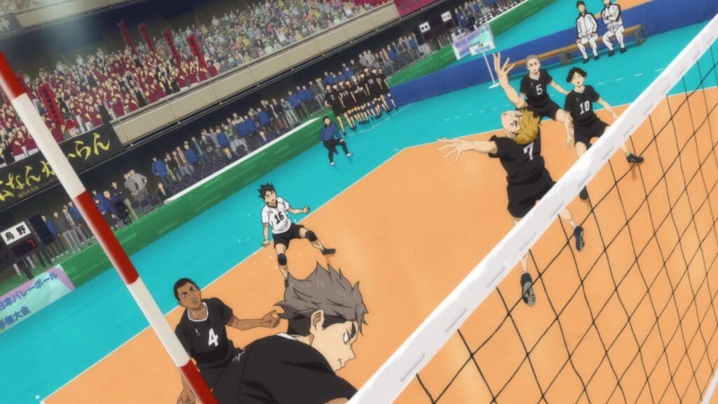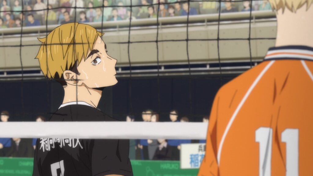Im Laufe des Matches schafft es auch Tanaka, immer besser zu werden, auch wenn einige Angriffe mal nicht gelingen. Dabei wird er von Kanoka angefeuert, die er seit seiner Kindheit kennt und die heimlich in ihn verliebt ist, auch wenn es für alle anderen außer Tanaka nicht sehr heimlich ist. Man sieht, wie Tanaka einst zur Karasuno kam, noch mit blonden Haaren und viel Selbstvertrauen und direkt am ersten Tag der Managerin Shimizu einen Heiratsantrag machte, den sie natürlich direkt abgelehnt hat. Man sieht die Wandlung, wie er einst von sich als Person sehr überzeugt war, im Glauben, besser als alle anderen zu sein, zu dem jetzigen Tanaka, der weiß, was er kann und was er nicht kann und der ein richtiger Teamspieler geworden ist, auf den sich seine Freunde verlassen können. Auch durch seine Anstrengungen schafft es die Karasuno, den ersten Satz knapp in der Verlängerung zu gewinnen.