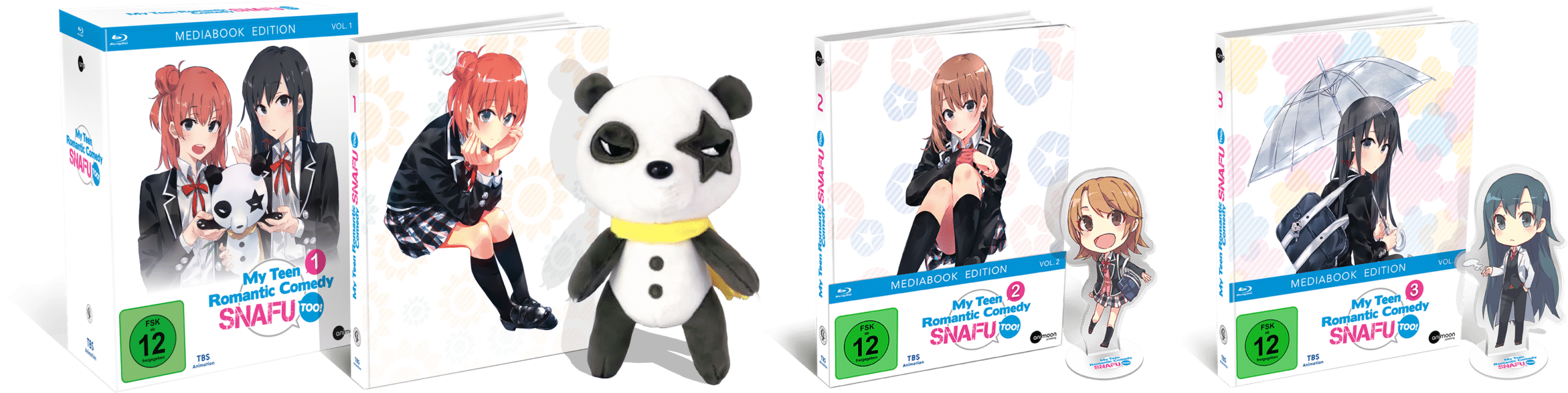 Auf dem Mediabook zu Volume 1 ist auf der Front Yui zu sehen, während Frau Hiratsuka die Rückseite ziert. Auf Volume 2 folgen dann Iroha und Hachimans Schwester Komachi, bevor dann auf Volume 3 Yukino und ihre große Schwester Haruno zu sehen sind.