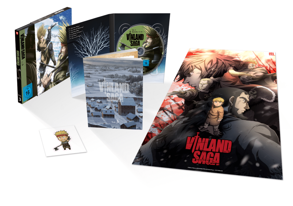 KAZÉ wird Volume 1 von “Vinland Saga” nun voraussichtlich am 07. April 2022 auf DVD und Blu-Ray in den Handel bringen. Neben einem Sammelschuber werden beim ersten Volume als weitere Extras ein 24-seitiges Booklet, ein Poster, ein Standee, ein Button, Sticker, sowie das Clean Opening und Ending mit an Bord sein. Die weiteren drei Volumes folgen dann voraussichtlich im Abstand von je einem Monat. Auch den Volumes 2 bis 4 werden wieder physische Extras beiliegen. Dabei handelt es sich jeweils um ein Booklet, ein Poster sowie Sticker.