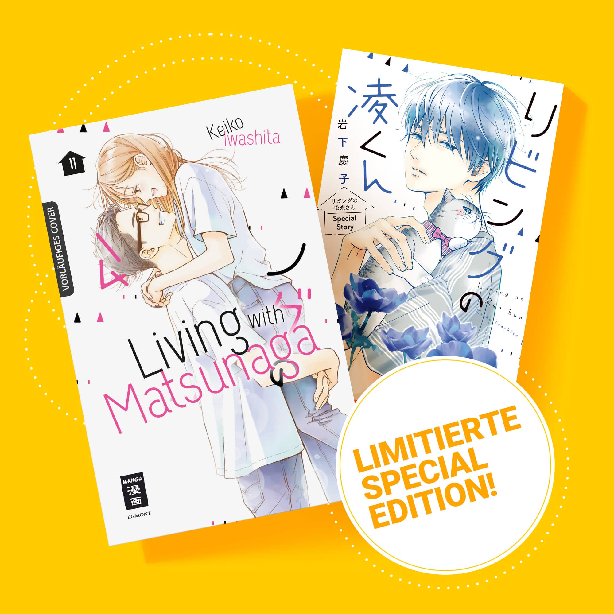 So erhält der elfte Band von „Living with Matsunaga“ eine Limited Edition, welche zudem ein zusätzliches Booklet als Extra beigelegt bekommt. Das Booklet ist ein 32-seitiger One-Shot mit dem Titel „Living with Ryo“. Die Kurzgeschichte erhielt man in Japan nur durch eine Verlosung. Inhaltlich geht es dort um die Beziehung zwischen Ryo und der WG-Katze Sabako. Die Limited Edition erscheint voraussichtlich am 11. Juli 2022 und wird 10 Euro kosten.
