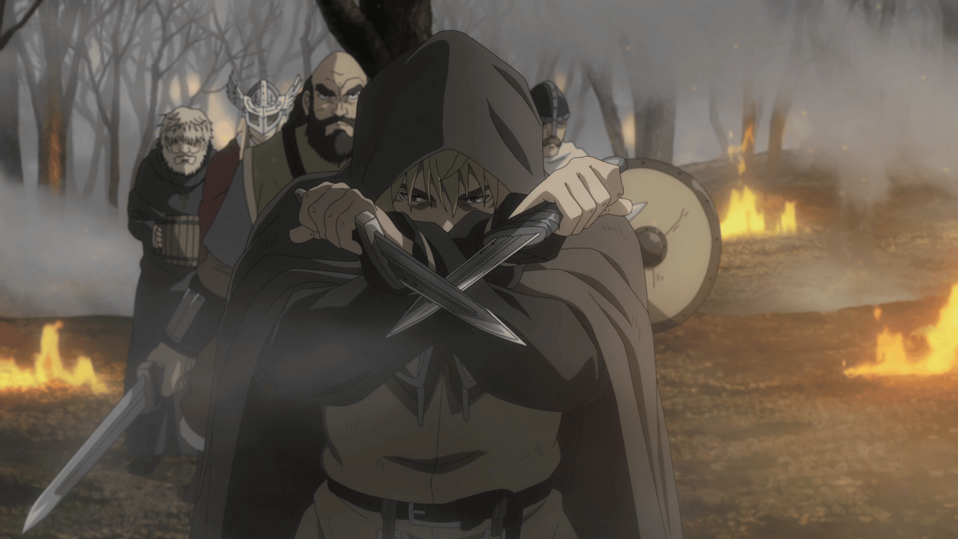 Thorfinn geht schnell in die Offensive und mit seinen zwei Dolchen kann er Askeladd immer weiter zurückdrängen, muss sich dann aber einem gewaltigen Hieb geschlagen geben, dessen Wucht er mit einem gekonnten Sprung rückwärts etwas abdämmt. Erneut geht der mutige Thorfinn in die Offensive und kann Askeladd sogar entwaffnen, doch zum finalen Schlag kommt es nicht, da dieser seinen Körper gekonnt in Szene bringt. Thorfinn bleibt nichts anderes über, als erneut Abstand zu gewinnen. Doch wieso kämpft Thorfinn überhaupt? Wie hieß sein Vater noch gleich? Askeladd provoziert Thorfinn bewusst, damit dieser blind vor Wut wird. Die Taktik scheint zu fruchten, denn völlig unüberlegt sprintet er Richtung Askeladd, der ihn aber mit einer Leichtigkeit entwaffnen und zu Boden bringen kann. Der Sieger des Kampfes steht fest – Askeladd.