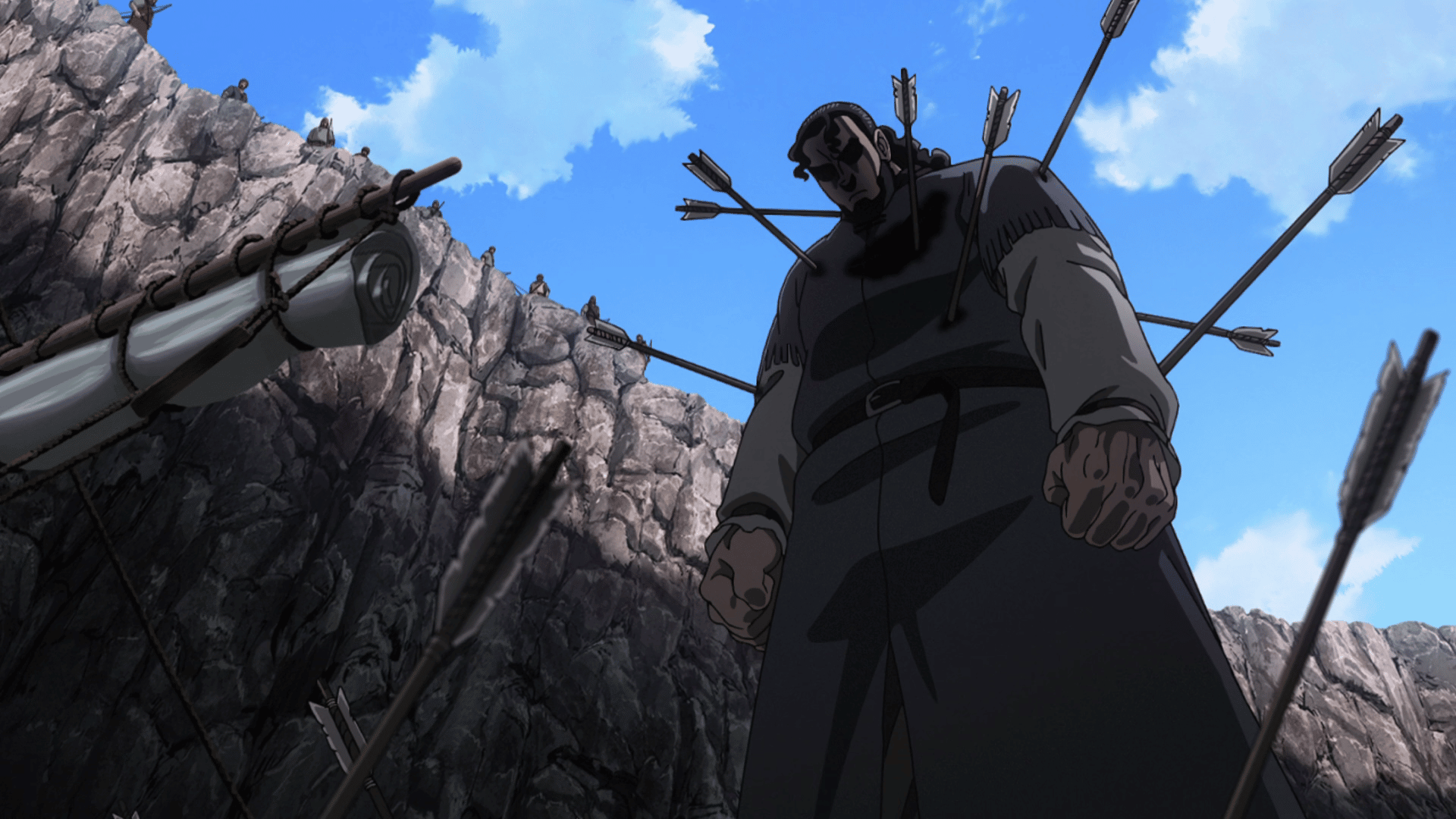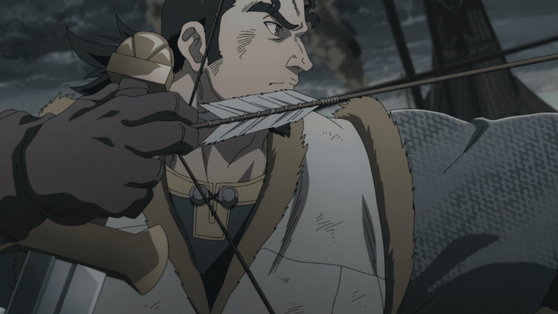 Ein Kampf um Leben und Tod bricht zwischen Thors und Askeladd aus, die alles von denen abverlangt. Askeladd setzt auf Intrigen und seine Schnelligkeit, kann sogar den ersten Schnitt setzen, doch im Verlauf des Kampfes gewinnt Thors die Überhand, entwaffnet ihn und setzt Askeladds eigenes Schwert an seinem Hals an. Thors gibt ihm wieder einmal die Chance sich zu ergeben, doch er wird vor seinen Männern keine Blöße zeigen. Askeladd ist beeindruckt von seinem Gegenüber. Er wurde besiegt, obwohl Thors 15 Jahre lang nicht mehr gekämpft hat. Er antwortet damit, dass das Schwert ihn hat unreif werden lassen. Erst ohne konnte er das Leben lernen. Ein wahrer Krieger braucht kein Schwert. Björn, der bereits von Thors geschlagen wurde, kommt wieder zu sich und schnappt sich den kleinen Thorfinn. Askeladd kommt aus dem Lachen nicht raus. Hat er wirklich geglaubt, dass er ein ehrenvoller Mann ist, der sich an sowas wie ein Zweikampf hält? Er wollte ich nur ein wenig amüsieren und rausfinden, was der berühmte Troll von Jom für einer ist. Nun soll er aufgeben, sonst wird sein Sohn und seine Männer ebenfalls sterben. Thors zeigt sich einsichtig, denn er möchte Thorfinn nicht in Gefahr bringen. Er wirft sein Schwert ins Meer und Askeladd gibt das Zeichen, wodurch die positionierten Bogenschützen ein Pfeilregen auf Thors abfeiern. Immer und immer wieder dringen Pfeile in den Körper von Thors ein, doch auf die Knie will er trotzdem nicht. Vielmehr will er erneut die Bestätigung von Askeladd haben, dass sich seine Männer zurückziehen werden. Dieses bejaht er und mit dem Wissen, dass Thorfinn nicht passieren wird, stirbt der Troll von Jom einen ehrenhaften Tod im Stehen.