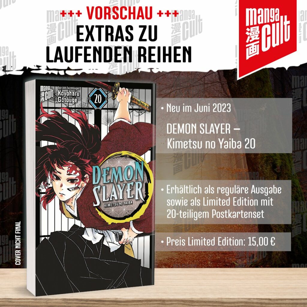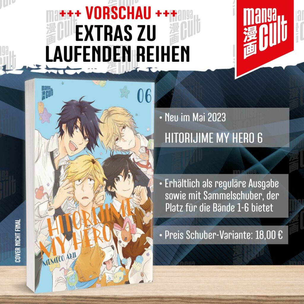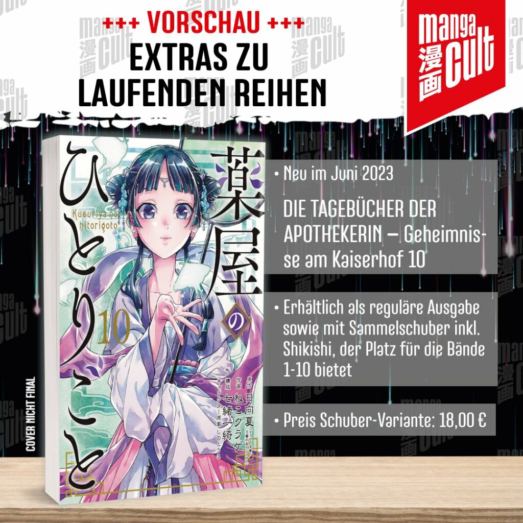 Es beginnt mit Band 20 der beliebten Reihe „Demon Slayer“. Dieser Band soll im Juni 2023 als reguläre Ausgabe und als Limited Edition mit einem 20-teiligen Postkartenset für 15€ erscheinen. Weiter geht es mit „DIE TAGEBÜCHER DER APOTHEKERIN – Geheimnisse am Kaiserhof“. Der zehnte Band, der ebenfalls im Juni 2023 erscheinen soll, wird einen Sammelschuber, der Platz für 10 Bände hat und ein Shikishi beinhalten. Für 18€ wird dieses Set erhältlich sein. Bereits im Mai 2023 erscheint indes der sechste Band von „HITORIJIME MY HERO“, der neben einer regulären Variante ebenfalls in einer Schuber-Version für 18€ erhältlich sein wird. In diesen Schuber passen dann 6 Bände.