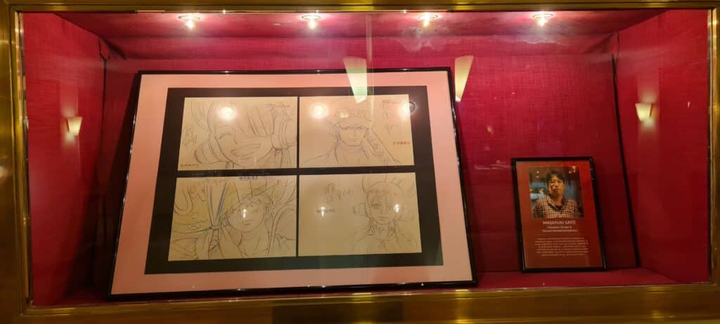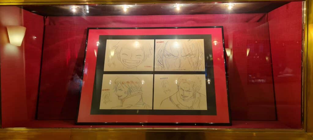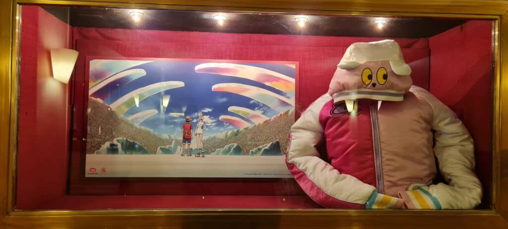 Nach dem Interview ist die Anspannung dann natürlich noch etwas weiter abgefallen und immer mehr „One Piece“-Fans, aber auch geladene Gäste, wie diverse Journalisten und Influencer, sind langsam, aber sicher eingetrudelt. Viele Fans sind zur Premiere sogar im Cosplay oder mit Flaggen der Strohhut-Piraten aufgetaucht. Die Vorfreude war spürbar groß, sind seit dem letzten „One Piece“-Film doch bereits drei Jahre vergangen. Die geladenen Gäste, zu denen auch Noé gehörte, haben alle noch eine Goodie-Bag bekommen, welcher Poster, Art-Cards, einen „One Piece Film: RED“-Eistee, einen Uta-Fächer und Popcorn beinhaltete, da der Delphi Filmpalast selbst kein Popcorn verkauft. Natürlich haben auch die Fans alle noch Popcorn bekommen. Bevor er sich in den Saal begab, nahm unser Redakteur noch am Fotocall teil, bei dem die Ehrengäste vor einer „One Piece Film: RED“-Fotowand posierten. Im selben Saal hat man außerdem einige Key-Frames zum Film, sowie eine Replika der Jacke, die Uta im Film trägt, ausgestellt.