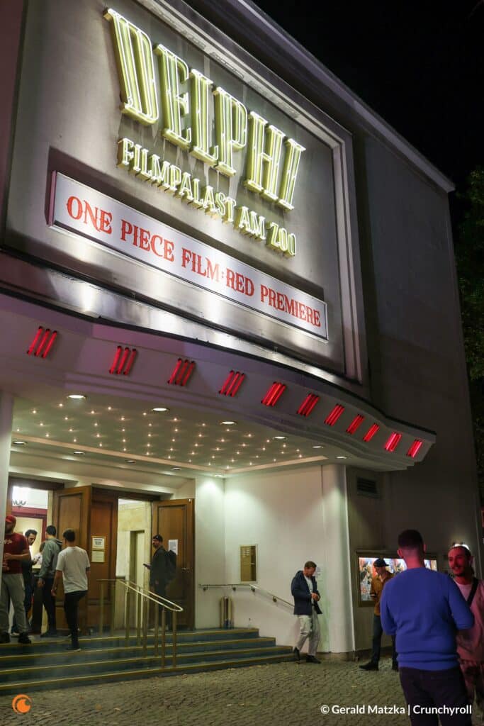 17 Uhr. Nachdem sich unser Redakteur bei einem Kaffee noch einmal auf das Interview eingestimmt hat, macht er sich auf den Weg zum „Delphi Filmpalast“, einem historischen Berliner Kino aus den 50er Jahren. Aufgrund des Interviews ist er bereits drei Stunden vor dem eigentlichen Filmstart vor Ort. Das Kino war im Prinzip auch nicht zu übersehen, zierte doch ein gigantisches „One Piece“-Plakat den Eingang zum Filmpalast. Genauso beeindruckend wie das Plakat war aber auch die Liebe zum Detail, mit der der Vorplatz des Kinos dekoriert und mit Aktivitäten ausgestattet wurde. Zum einen wurde ein Bus aufgebaut, an dem man mit dem Dreh an einem Glücksrad verschiedene Goodies passend zu „One Piece Film: RED“ gewinnen konnte. T-Shirts, Regenschirme und sogar Eistee standen auf der Liste der Preise. Alles, was das „One Piece“-Fanherz begehrt. Doch nicht nur das: Auf einer extra für das Event aufgestellten Leinwand wurden Trailer zum Film, Nachrichten des neuen Charakters „Uta“, sowie Trailer zum kommenden Videospiel „One Piece: Odessey“ gezeigt. So hat auch der letzte Fan zum Eingang gefunden. Da die Premiere jedoch erst drei Stunden später beginnen sollte, war zu diesem Zeitpunkt noch kaum jemand vor Ort.