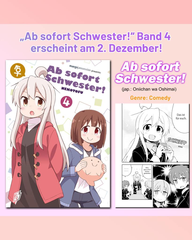 Dank der erfolgreichen Crowdfunding-Kampagne von Manga JAM Session steht fest, dass der Manga „Ab sofort Schwester!“ (jap.: Oniichan wa Oshimai) hierzulande einen vierten Print-Band erhalten wird. Nun ist bekannt, wann genau dieser Band in den Handel kommt.
