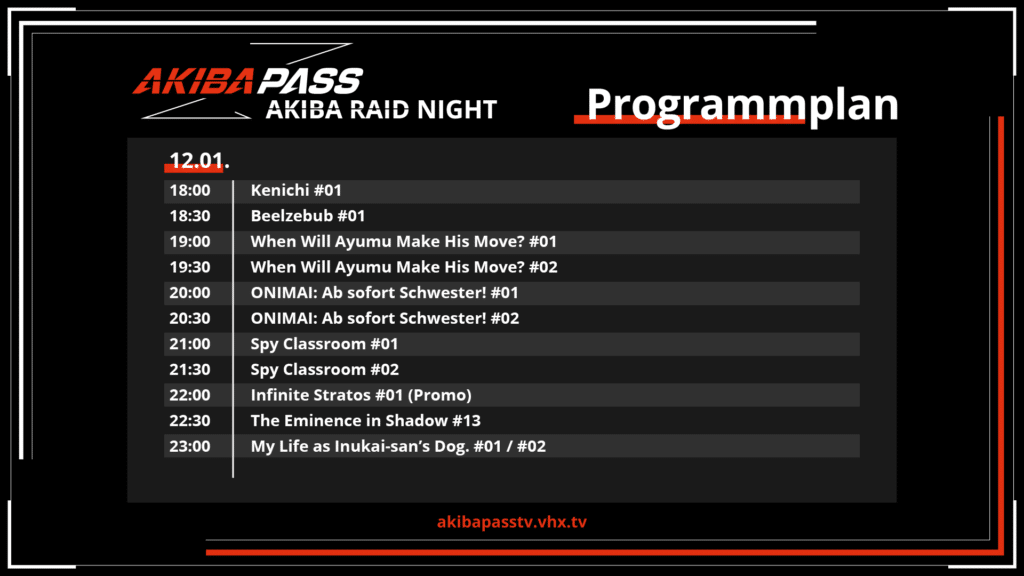 Passend zum Start der neuen Anime-Season, die seit Anfang Januar läuft, bietet der Publisher nun allen Interessierten an, die erste AKIBA RAID NIGHT des Jahres kostenlos zu verfolgen, um sich einen Eindruck des Events machen zu können. Der Programmplan beinhaltet dabei neben den jeweils ersten beiden Episoden der bereits angekündigten Simulcast-Titel „Spy Classroom“, „ONIMAI: Ab sofort Schwester“ sowie „My Life as Inukai-san’s Dog“ (auch via aniverse verfügbar) auch eine weitere Episode des weiterlaufenden Simulcasts „The Eminence in Shadow“, die Serie „When Will Ayumu Make His Move“ aus der Sommer-Season 2022 und mehr.