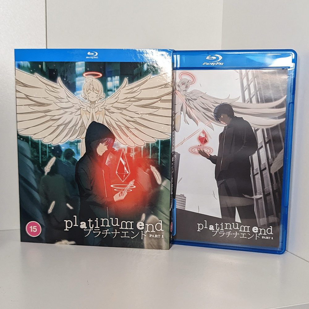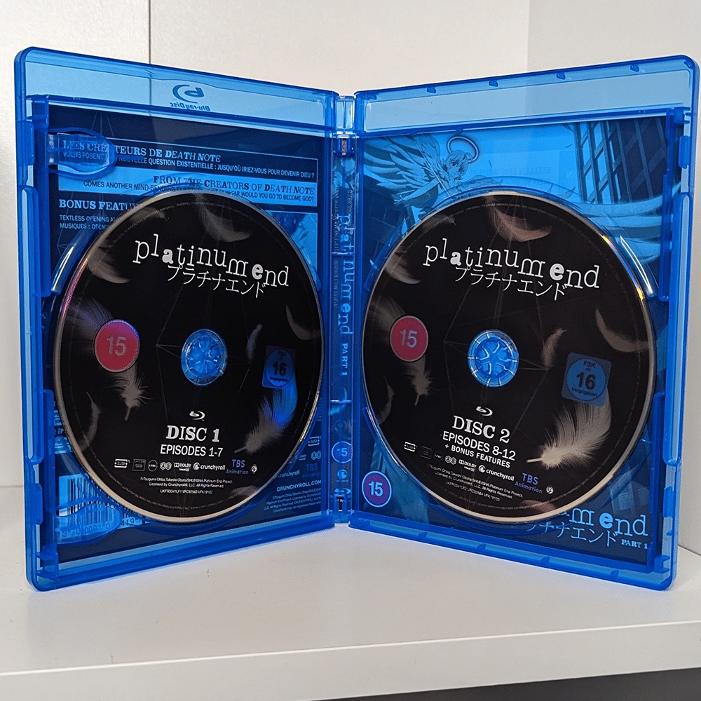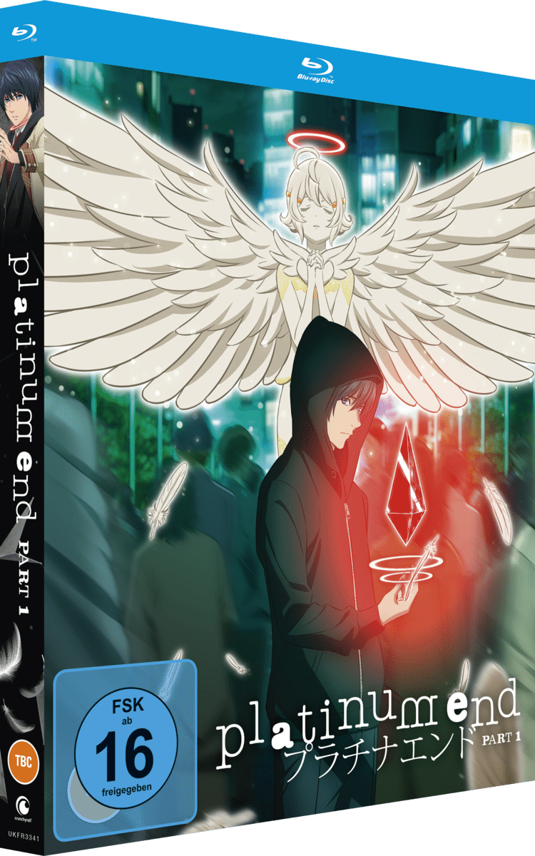 Der Anime „Platinum End“ wird bei Crunchyroll unter dem Prädikat Gesamtausgabe vertrieben und das bedeutet für den Käufer, dass die physische Umsetzung sehr einfach gehalten ist. Die Disc wird in einer Blu-ray-Hülle ausgeliefert, die von einem Pappschuber umhüllt ist. Darauf abgebildet ist der Protagonist Mirai Kakehashi gemeinsam mit dem Engel Nasse. Auf dem Pappschuber selbst ist das Siegel der britischen Alterseinstufung eingebrannt, während auf dem Cover-Design das FSK-Logo ab 16 Jahren zu sehen ist. Wer aus dem großen blauen Quadrat einen kleinen roten Kreis machen möchte, kann hierfür das Cover einmal wenden. Dadurch hat man zweimal die britische Alterseinstufung ab 16 Jahren im Regal. Auf physische Extras wurde komplett verzichtet. Lediglich auf der Disc selbst findet man das Clean Opening sowie das Ending.
