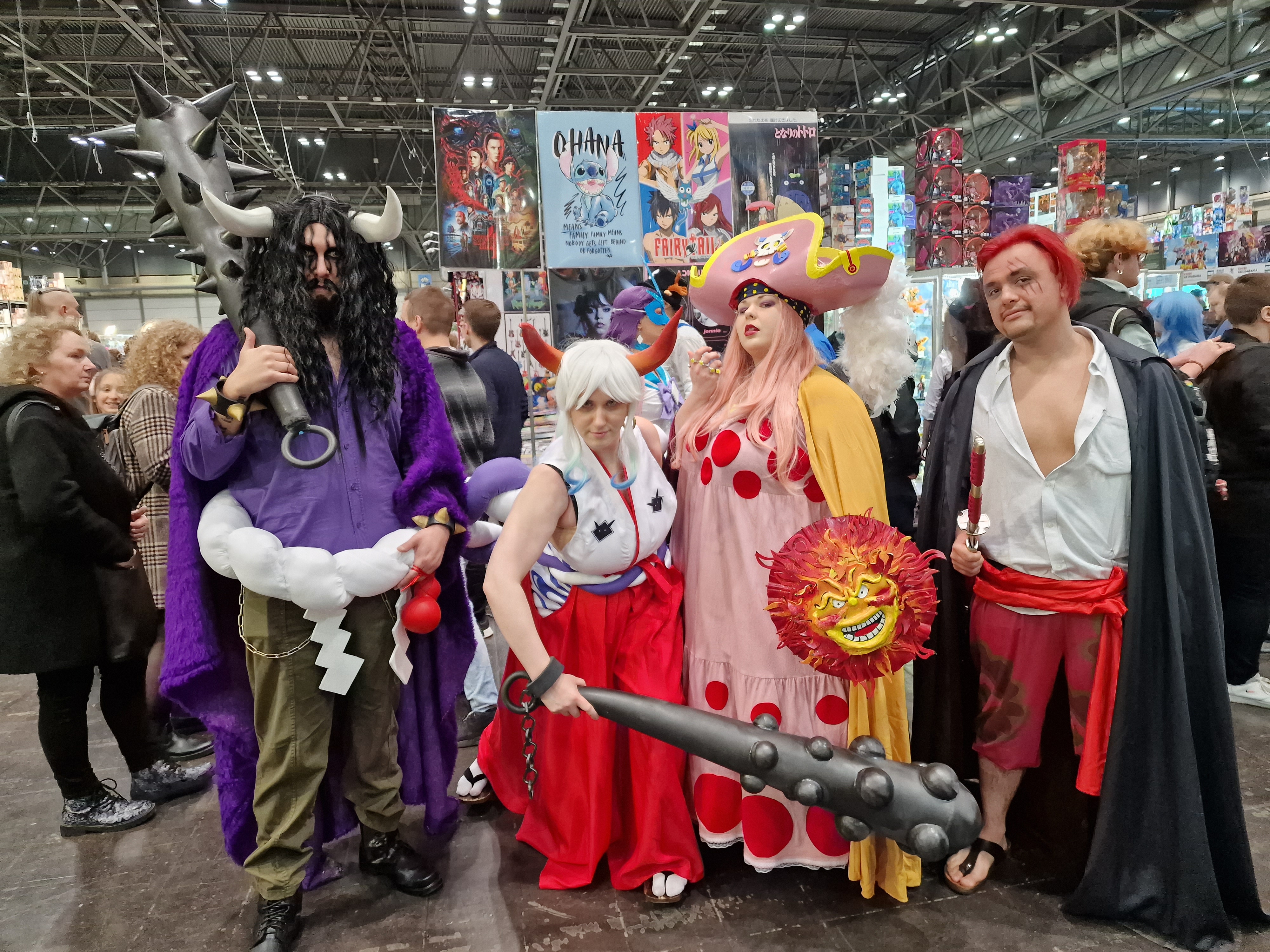 Der Signierbereich in Halle 1 war in 5 Tische aufgeteilt, wobei die KünstlerInnen, bei denen die meisten Fans erwartet wurden, am Tisch 5 saßen, da von dort aus eine schlangenförmige Reihung hinter dem Bereich möglich war. Wer dort ein Autogramm bekommen wollte, beispielsweise von den „Attack on Titan“-Synchronsprechern oder Ralph Ruthe, der musste früh da sein und einiges an Zeit und Geduld mitbringen. Auf dem schwarzen Sofa gab es wieder einige interessante Diskussionen und Interviews und auf der großen Bühne wurde täglich viel Programm geboten wie ein Panel mit den AoT-Sprechern oder der Leipziger Cosplaywettbewerb. Schöne Cosplays waren aber überall zu sehen. Wir selbst waren als (einer von gefühlt 1000) Tanjiros aus „Demon Slayer“ unterwegs, aber aus nahezu allen bekannten und unbekannteren Serien waren Charaktere zu sehen. Besonders eindrucksvoll war auch die „One Piece“-Gruppe am Samstag (siehe Bild).