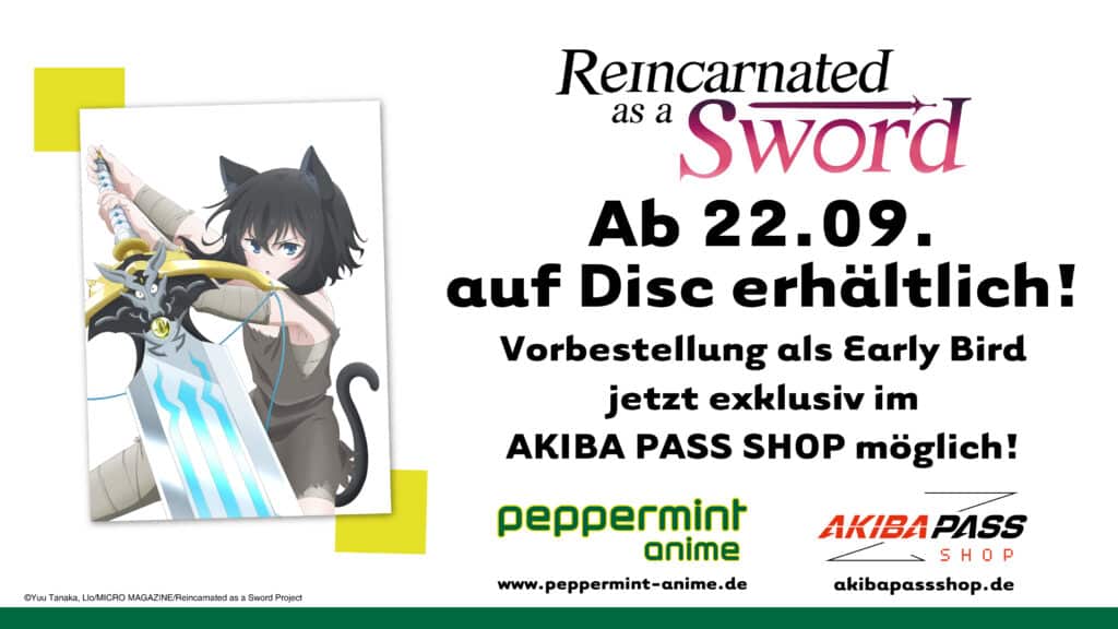 Wie der Publisher peppermint anime im Rahmen der neuen „AKIBAPASS CLUBHOUSE“-Ausgabe bekannt gegeben hat, wird man die Anime-Serie „Reincarnated as a Sword“ noch in diesem Jahr auf Disc veröffentlichen.