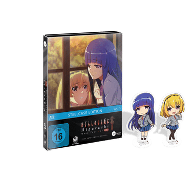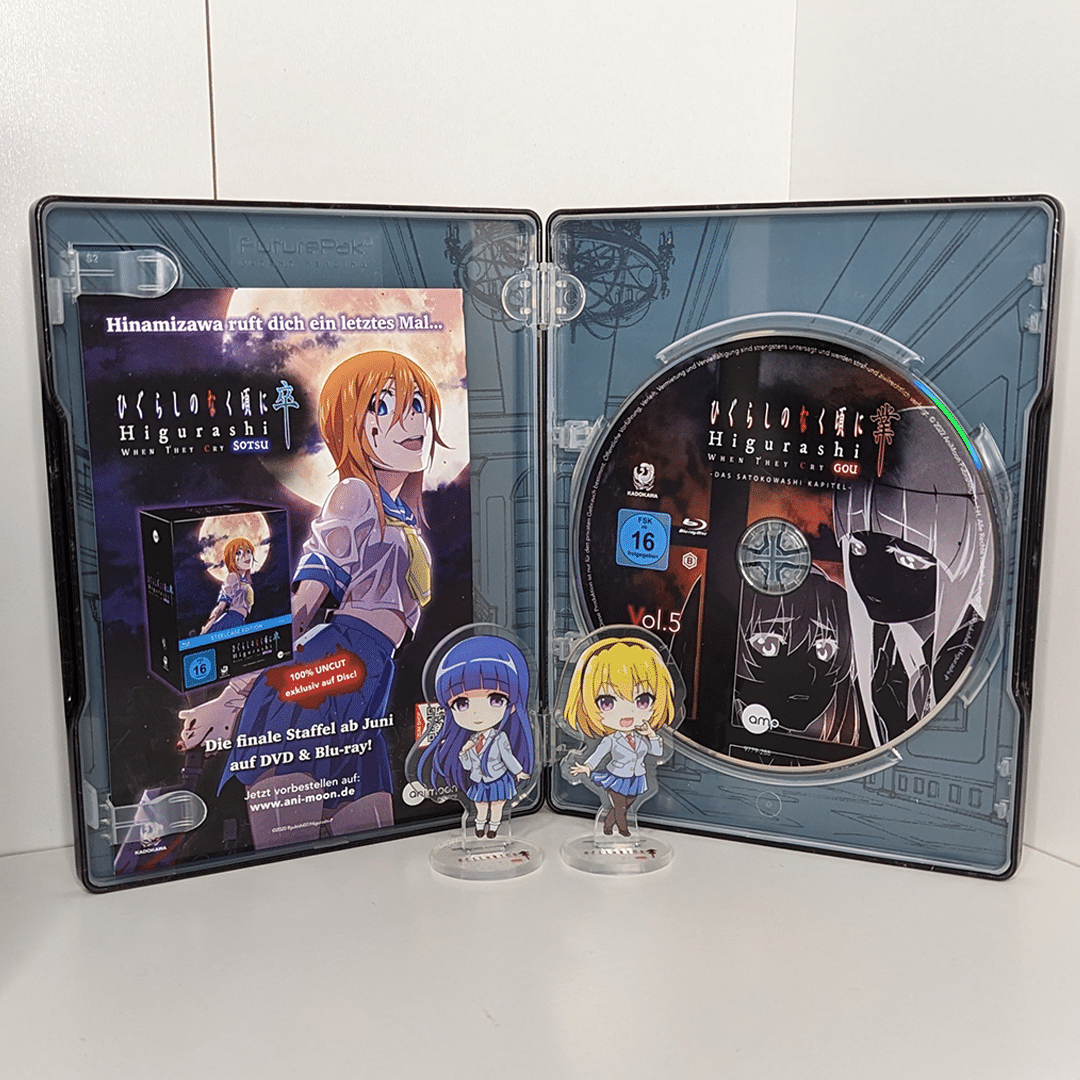 Das fünfte Volume steht ganz im Zeichen von Rika und Satoko, weshalb die Freundinnen auch das Steelcase sowie die PET Wende-O-Card schmücken. Im finalen Volume bekommt man gleich zwei exklusive Acrylfiguren und zwar Rika und Satoko in ihren Schuluniformen. Auf digitale Boni muss man auch hier nicht verzichten, denn auch Volume 5 kommt mit dem Clean Opening sowie Clean Ending daher.