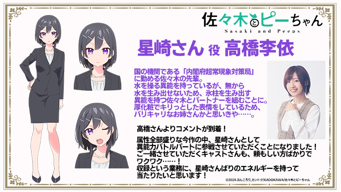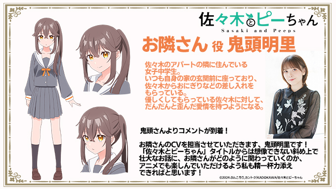 Seit Juli 2022 ist bekannt, dass die Novel-Reihe „Sasaki and Peeps“ (jap. Sasaki and Pichan) von Autor Buncololi und Illustrator Kantoku als TV-Anime adaptiert wird. Nun wurden während des „MF Bunko J Sommer Schulfestivals“ neue Informationen enthüllt.