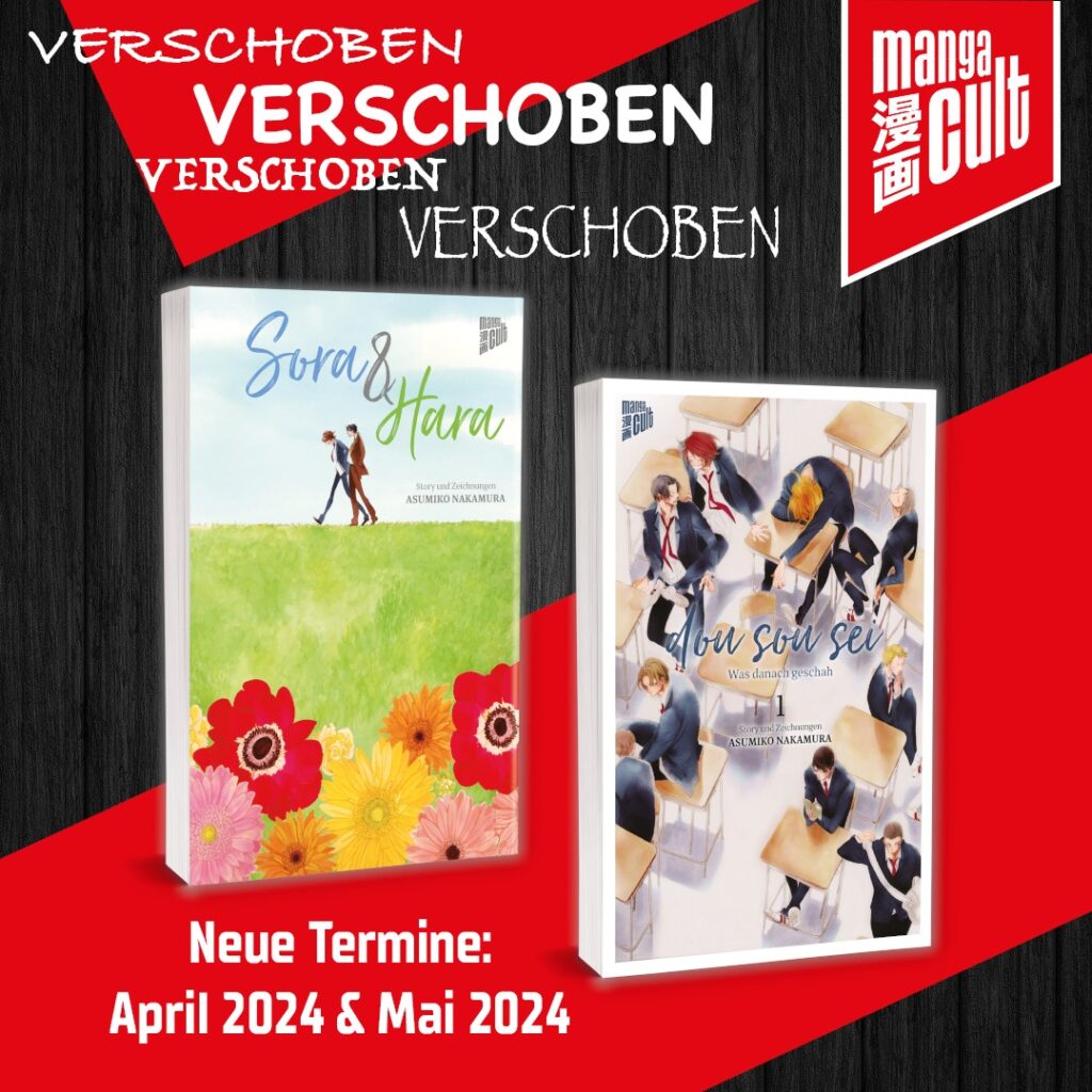Bei den beiden Titeln, deren Start Manga Cult verzögern muss, handelt es sich um „Sora & Hara“ und „Dousousei – Was danach geschah“. Der Einzelband „Sora & Hara“ hätte eigentlich im November 2023 veröffentlicht werden sollen. Nun kommt dieser erst im April 2024 heraus. Der erste Band des Zweiteilers „Dousousei – Was danach geschah“ hätte im Januar 2024 in en Handel kommen sollen, doch das verschiebt sich auf den Mai 2024. Der zweite Band erscheint dafür gleich darauf im Juni 2024. Der Verlag versicherte jedoch, dass zumindest „Die Chroniken des Königsreichs“ von Asumiko Nakamura planmäßig im November 2023 veröffentlicht wird und Folgebände im zweimonatlichen Rhythmus auf den Markt kommen.