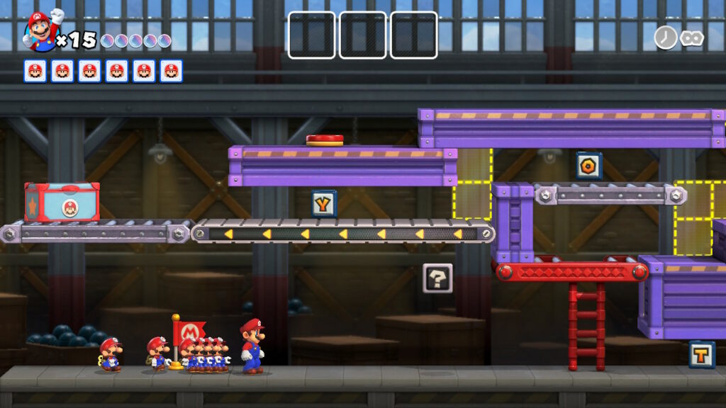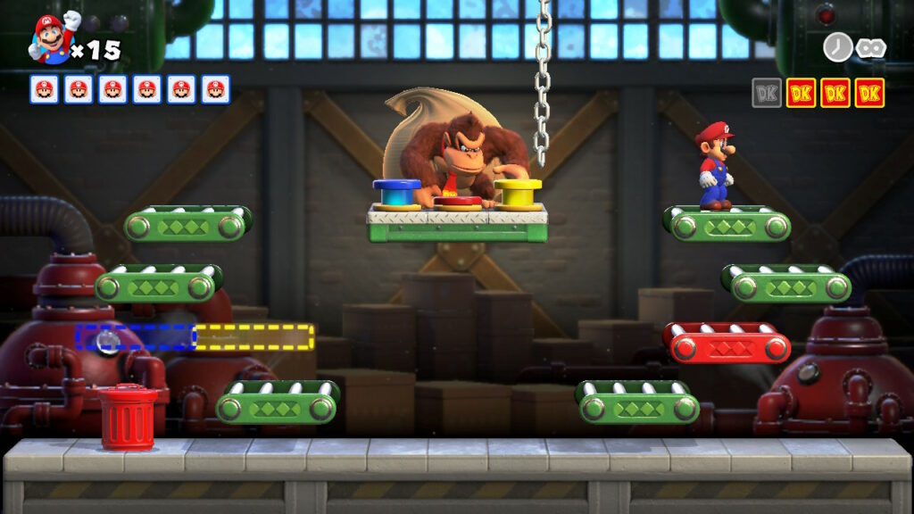 Ihr habt die Möglichkeit verschiedene Schalter umzulegen, um Plattformen verschwinden oder erscheinen zu lassen, aber ihr könnt euch ebenfalls die Fließbänder zu nutze machen. Auch herumstehende Mülltonnen dienen als Tritthilfe oder auch als Waffe, um Shy Guys zu eliminieren. In dem Spiel müsst ihr brennenden Ölfässern und Shy Guys ausweichen, denn diese fügen Schaden zu. Insgesamt ist das Gameplay aber sehr gemütlich gehalten und das Spiel eignet sich bestens für ein entspanntes Spielen zwischendurch ohne viel Druck und Hektik zu haben. Natürlich ist es auch ein Puzzle-Spiel, weswegen ab und zu auch ein wenig Mitdenken gefragt ist. Jedoch lassen sich die Level durch logisches Denken relativ leicht lösen und sind auch für kleinere Kinder gut zu meistern.