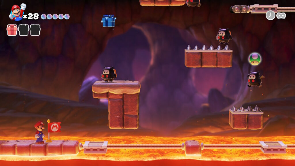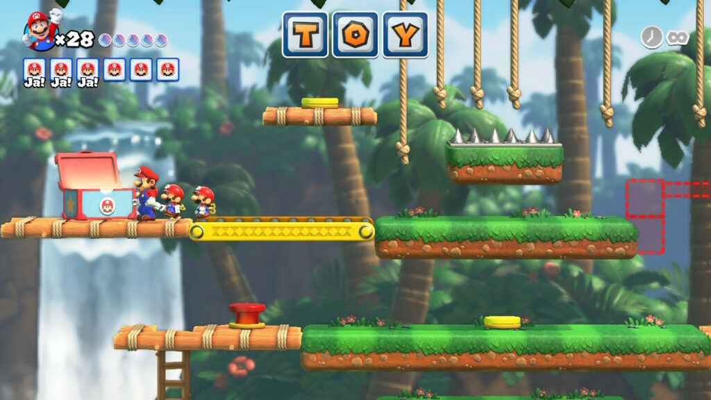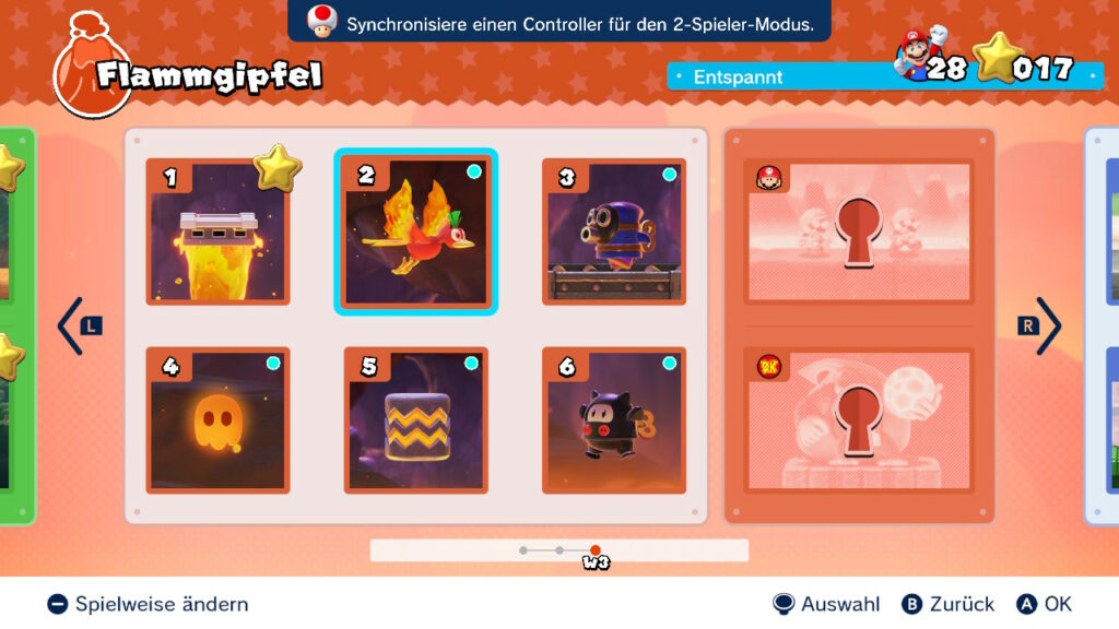 Zuvor haben wir euch das Gameplay in den normalen Leveln erläutert. Doch es gibt auch besondere Level. Dabei gibt es Level, in denen ihr die bereits befreiten Mini-Marios durch einen Parkour zu einer Spielzeugkiste führen müsste. Zudem habt ihr dort die Möglichkeit die Buchstaben T, O und Y einzusammeln, damit ihr das Wort Toy bildet und einen Stern bekommt. Diese Level sind zwar kurz, bieten aber auch einen gewissen Kniff an Herausforderung, da die Mini-Marios euch die ganze Zeit verfolgen und ihr zusehen müsst, dass alle sicher an das Ziel kommen. Manchmal müsst ihr da ein wenig überlegen und Geschicklichkeit beweisen, damit alle Mini-Marios unbeschadet die Spielzeugkiste erreichen. Das macht allerdings viel Spaß.