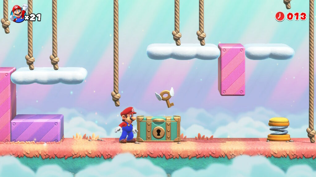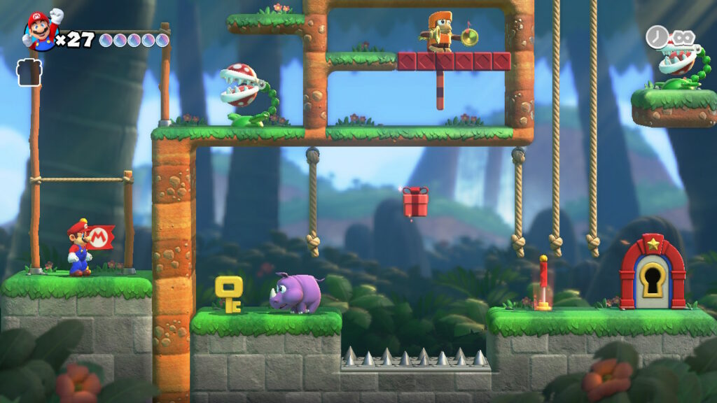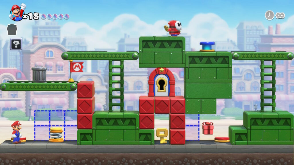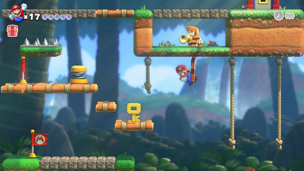 Ein normales Level ist jeweils in zwei Abschnitte unterteilt. Zunächst müssen wir den Schlüssel zum Schlüsselloch transportieren, um weiterkommen zu können. Dies ist zu Beginn des Spiels zunächst ganz einfach, aber der Schwierigkeitsgrad steigt je mehr Level ihr absolviert. Bei dem Schlüssel handelt es sich um ein physisches Objekt und wenn ihr ihn für zwölf Sekunden aus der Hand legt, kehrt er wieder an seine Startposition zurück. Dementsprechend ist hier Timing und auch eine entsprechende Taktik gefragt. Habt ihr dies geschafft, müsst ihr im zweiten Teil von dem Level dann den Mini-Mario retten. Grundsätzlich sind beide Levelabschnitte gleich, nur das Ziel ist etwas anders.