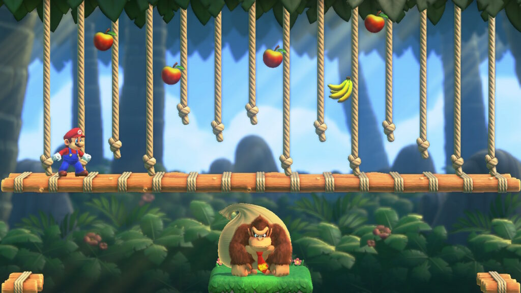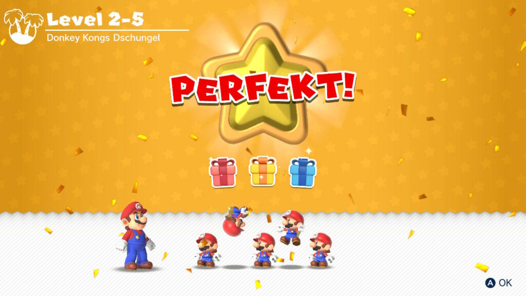 Zusätzlich gibt es noch Level, welche eine Art Bosskampf darstellen. Dieser Bosskampf steht typischerweise am Ende einer Welt an. Wenig überraschend ist es dann auch, dass dieser Bosskampf gegen Donkey Kong erfolgt, eurem Antagonisten und dem Dieb der Mini-Marios. Dabei ist Donkey Kong auf einer höheren Plattform gelegen und attackiert euch mit Holzfässern, genauso wie im früheren Klassiker. Das Prinzip der Bosskämpfe ist immer gleich, aber es wird nicht langweilig, da die Bosskämpfe jedes Mal eine Art Variation darstellen. Es kann nämlich auch passieren, dass Donkey Kong euch nicht mit Fässern, sondern mit Bomben attackiert oder der Boden unter euch auf einmal verschwindet. Also gibt es jedes Mal eine kleine neue Herausforderung.