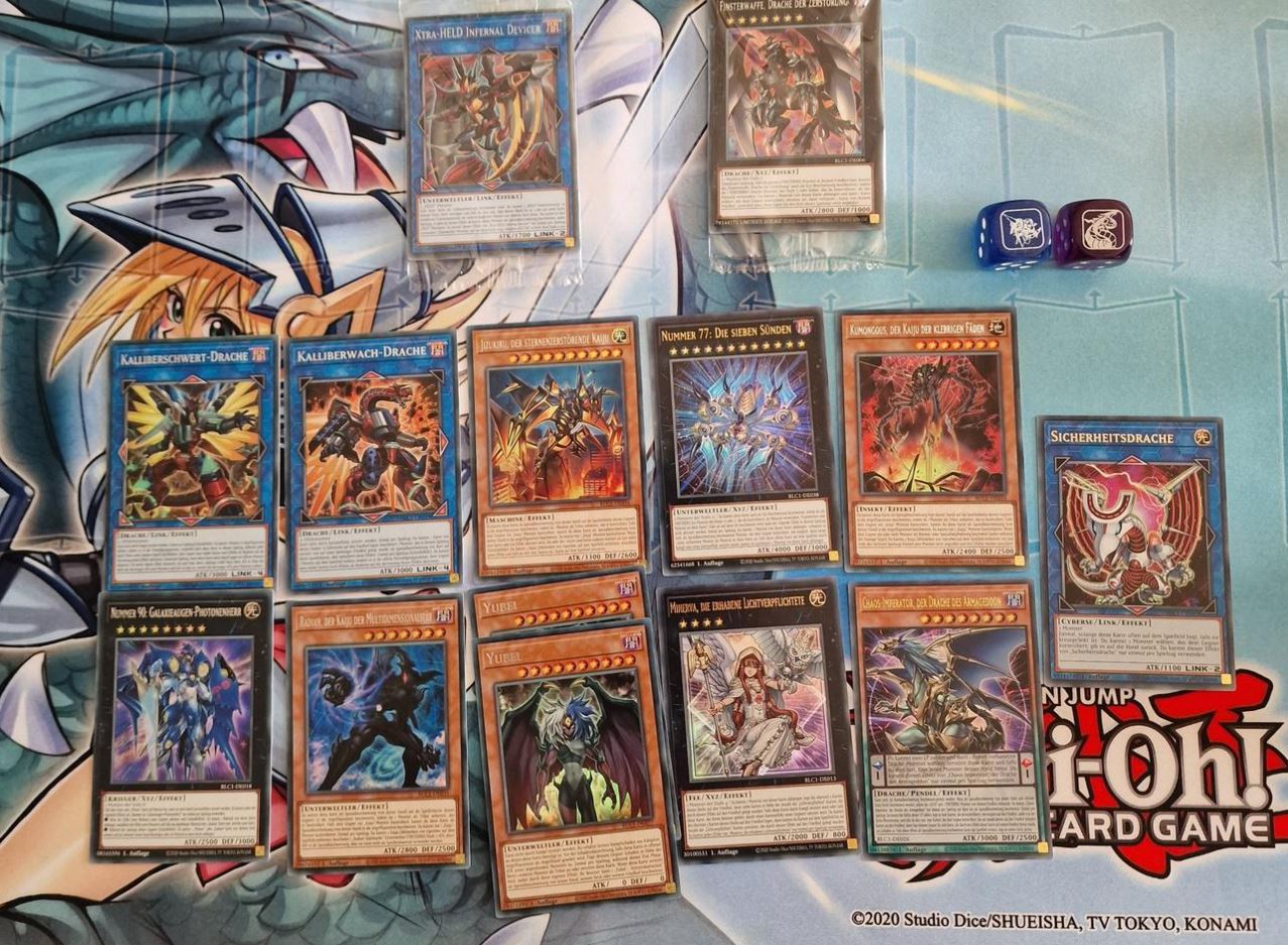 Wir durften 2 Boxen von „Battles of Legends“ und ein Display von „Phantom Nightmare“ öffnen, die uns Konami freundlicherweise zur Verfügung gestellt hat. Bei „Battles of Legends“ hatten wir pro Set eine extra verpackte Karte (Finsterdrache und Devicer, siehe Bild), sowie zwei Würfel, ein Würfel pro Box. Der schwarze Würfel ist vom Cyberdrachen, der blaue von Grosalamander. Ansonsten waren die Holos divers verteilt. Einige Kaijus waren drin, ein paar Linkmonster, ein Pendelmonster und drei XYZ-Monster. Sowie zweimal der zuvor erwähnte „Yubel“.