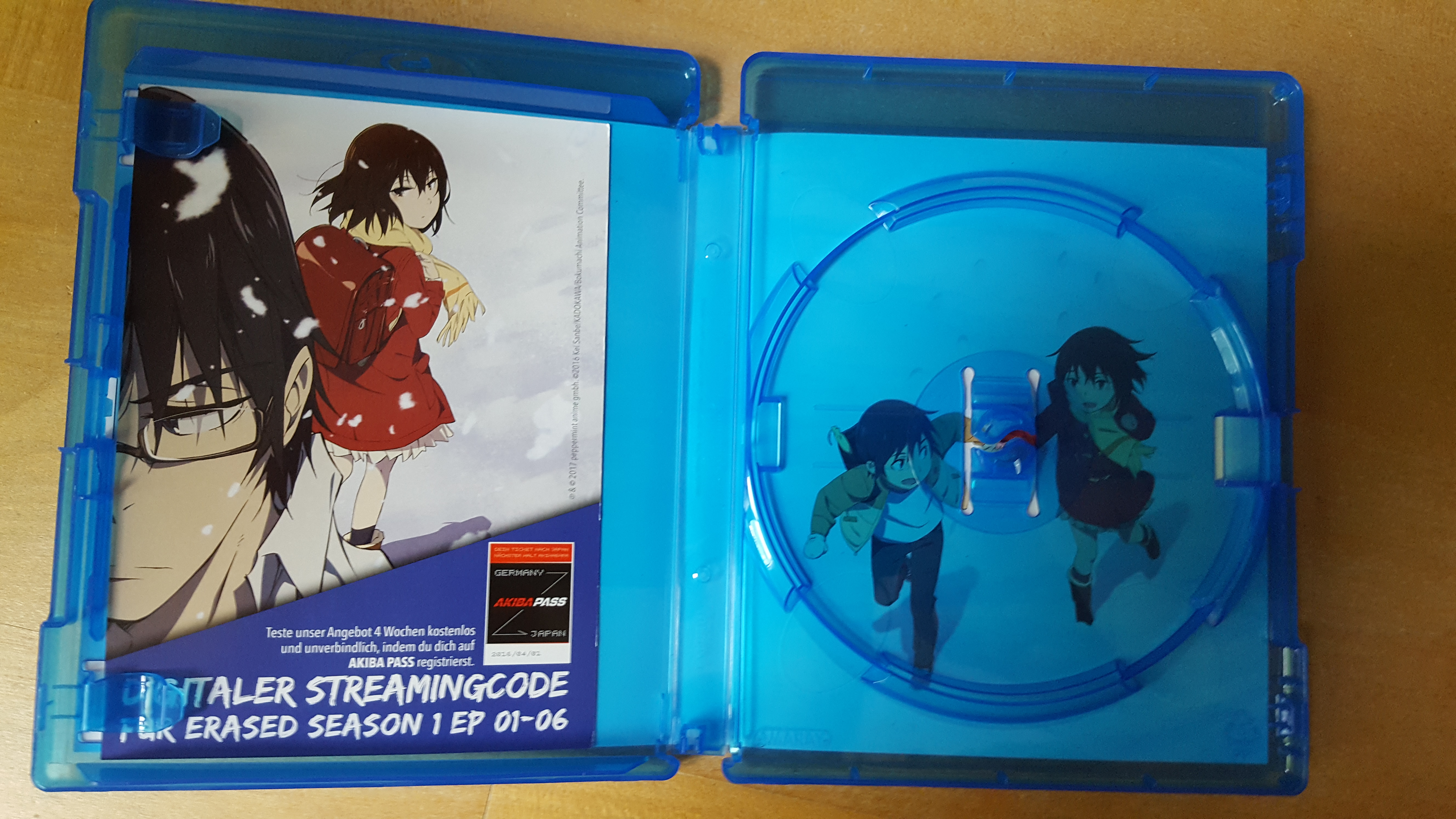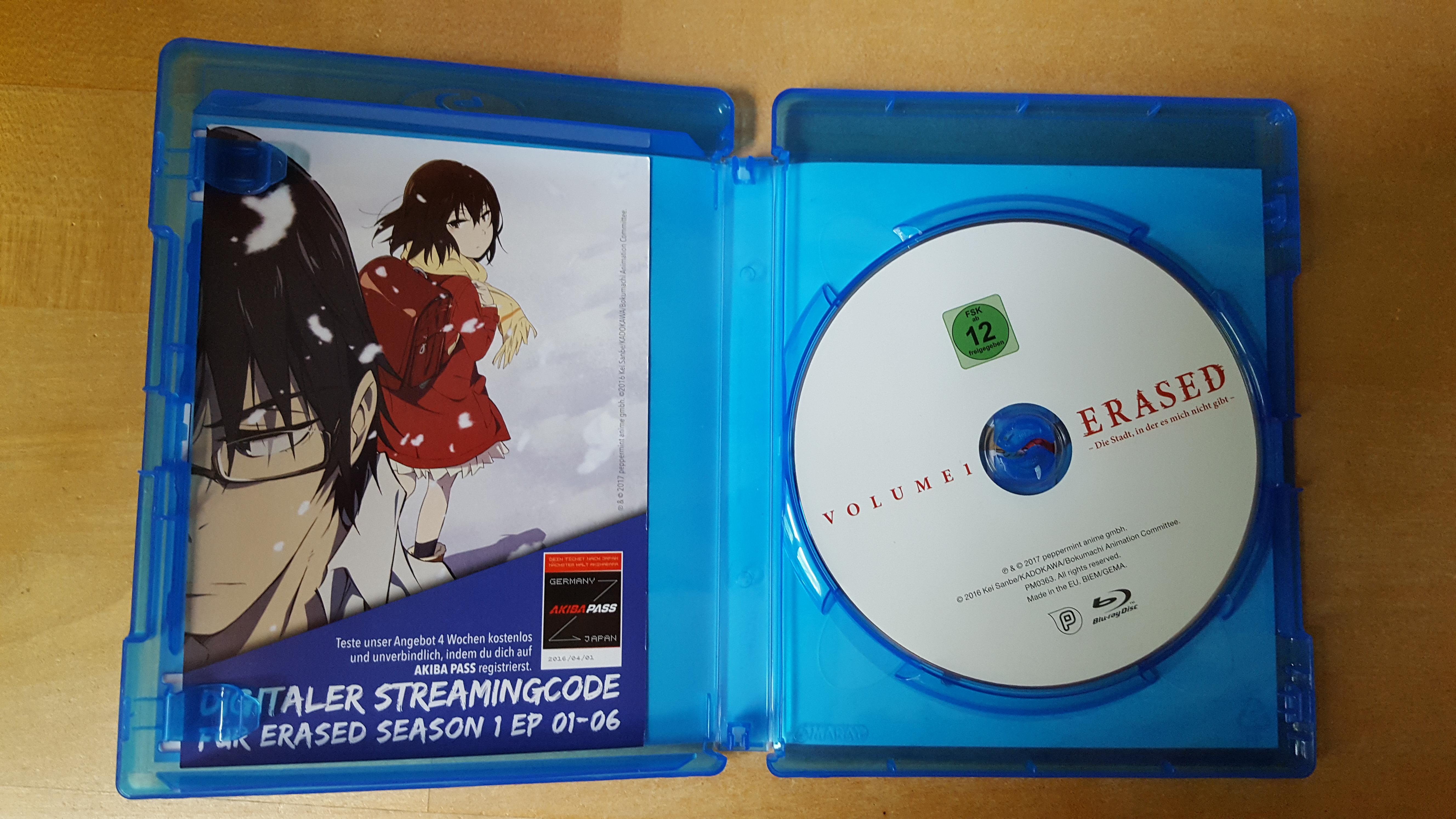 In der Hülle enthalten sind sowohl die Disc, die die ersten sechs Episoden der Serie enthält, als auch ein Streaming-Code für Akiba Pass, der es einem erlaubt, die erworbenen Folgen auch digital anzusehen. Neben dem Anime finden sich auf der Disc übrigens auch noch einige Trailer zu weiteren aktuellen Veröffentlichungen von peppermint anime sowie als Bonus das Clean-Opening und Clean-Ending von „Erased“.
