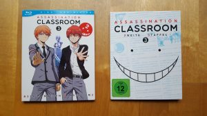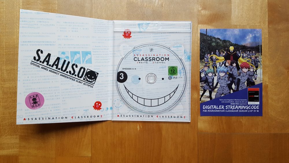 Volume 3 der zweiten Staffel von „Assassination Classroom“ kommt wie seine Vorgänger im Digipack daher, welches in einem eigenen Pappschuber steckt. Dieser wirkt auch wieder recht stabil. Auf ein aufgedrucktes FSK-Logo wurde hier löblicherweise erneut verzichtet. Dieses befindet sich stattdessen wieder auf dem Digipack selbst, was jedoch annehmbar ist, da sich dieses sowieso meistens im Schuber befindet. Im Inneren des Digipacks befinden sich wie gewohnt die Disc sowie ein Code, der es dem Käufer erlaubt, die erworbenen Folgen auch digital bei AKIBA PASS anzuschauen.