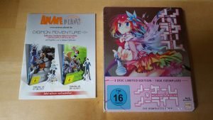 Exemplarisch haben wir uns hier für das auf 1000 Stück limitierte Blu-Ray FuturePak von No Game, No Life entschieden, welches die komplette Serie auf drei Discs enthält. Zunächst einmal waren wir sehr positiv überrascht, als das Paket bei uns eintraf, denn man hat das Produkt hier wirklich großzügig verpackt. Das ist in sofern sehr löblich, als dass damit Transportschäden im Grunde ausgeschlossen werden. Im Paket selbst befand sich neben dem eigentlichen FuturePak nur noch ein kleines Reklameheftchen, in dem sich Werbung zu den weiteren limitierten Sonderditionen, aber auch zu ganz normalen Veröffentlichungen von KSM Anime findet, die man bei Anime Planet erwerben kann: