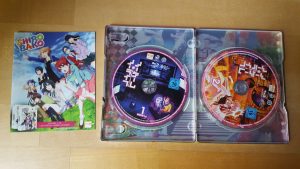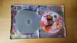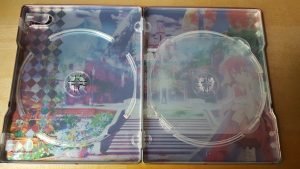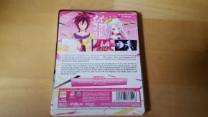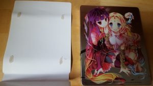 Öffnet man die Hüllle nun, gibt das den Blick auf die Discs sowie ein kleines Booklet frei. In diesem Heft findet ihr noch einmal ein wenig umfangreichere Informationen zum Programm von KSM Anime, als es im kleinen Reklameheft der Fall ist, das der Bestellung – wie oben beschrieben – ebenfalls beilag. Entfernt man alle drei Discs aus dem FuturePak, so hat man nun eine wunderbare Illustration zu No Game, No Life vor sich.