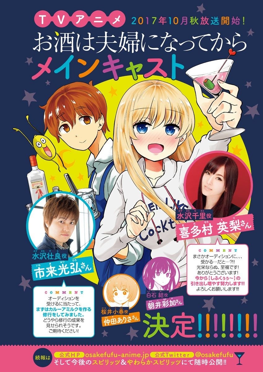 Bereits Ende April berichteten wir euch, dass Crystal na Yousukes Mangareihe „Osake wa Fuufu ni Natte kara“ eine Anime-Adaption erhalten wird. Nun wurden die ersten Sprecher zum Anime preisgegeben.