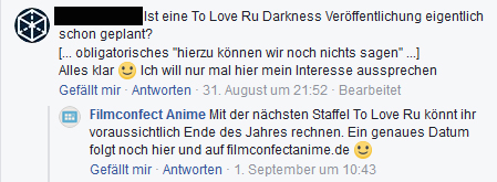 Lange war es still um neue Veröffentlichungen von FilmConfect. Auf Facebook äußerte sich der Publisher nun allerdings zu seinen Plänen für die nähere Zukunft. Dabei gab es auch Informationen zur Veröffentlichung von To Love-Ru -Trouble- Darkness.