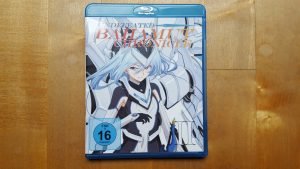 Volume 2 von Undefeated Bahamut Chronicle kommt wie schon der Vorgänger in einer Amaray Blu-Ray-Hülle daher. Auf dem Cover finden wir diesmal eine Illustration von Krulcifer Einfolk in voller Drag-Knight Montur. Das fest aufgedruckte FSK-Logo auf der Front kann glücklicherweise ignoriert werden, da man hier löblicherweise an ein Wendecover gedacht hat. Im Inneren der Hülle findet der Käufer neben der Disc, die diesmal die Episoden 4 bis 6 der Serie enthält, auch wieder einen Sticker im Design des Covers. Auch ein kleines Booklet liegt dem Ganzen wieder bei. In diesem finden sich wiederum Informationen zu einigen der wichtigsten Charaktere sowie Charakterdesigns und Illustrationen. Auf der Rückseite des Booklets findet der Käufer Beschreibungen zu den drei in diesem Volume enthaltenen Folgen von Undefeated Bahamut Chronicle.