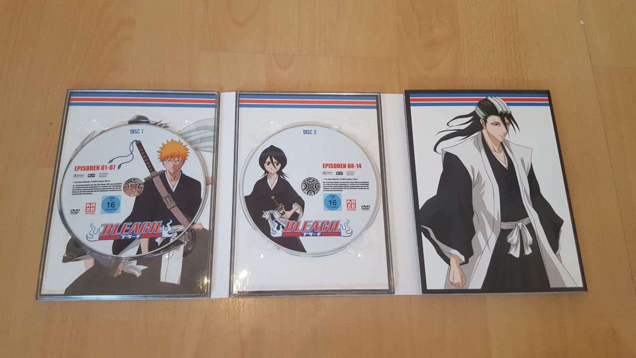 Die drei DVDs der ersten Box von Bleach, welche die Episoden 1-20 beinhaltet und somit die erste Staffel der Serie enthält, befinden sich in einer Klappverpackung aus stabilem Karton in Hochglanz-Optik mit passendem Schuber, auf welcher außen allerdings das FSK 16-Logo aufgedruckt ist und sich somit nicht entfernen lässt. Der Schuber sowie die eigentliche Verpackung der DVDs sind in einem passenden Farbschema in Schwarz, Rot und Blau gehalten – die selben Farben, die auch das Bleach-Logo beinhaltet. Im Inneren der Verpackung befindet sich kein Beiheft zum Anime, sondern nur ein kleines Werbeheft von KAZÉ, welches kommende Anime-Veröffentlichungen vorstellt.