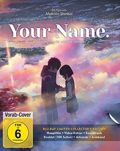 Durch entsprechende Produkteinträge beim Online-Versandhändler Amazon.de ist nun klar, dass der Film neben einer Standard-Variante als DVD und Blu-Ray auch eine Blu-Ray Limited Collector’s Edition erhalten wird. Voraussichtliche rErscheinungstermin für alle drei Varianten ist der 18. Mai 2018. Dem Eintrag zur Collector’s Edition ist zudem zu entnehmen, dass Fans sich bei dieser als Extras auf die Videos „Filmografie Makoto Shinkai“, „Special TV-Programm“ sowie das Textless Opening freuen können. Weitere Boni sind ein Booklet, der Orginal Soundtrack Your Name. (Kimi no Na wa.) by Radwimps und ein Armband.