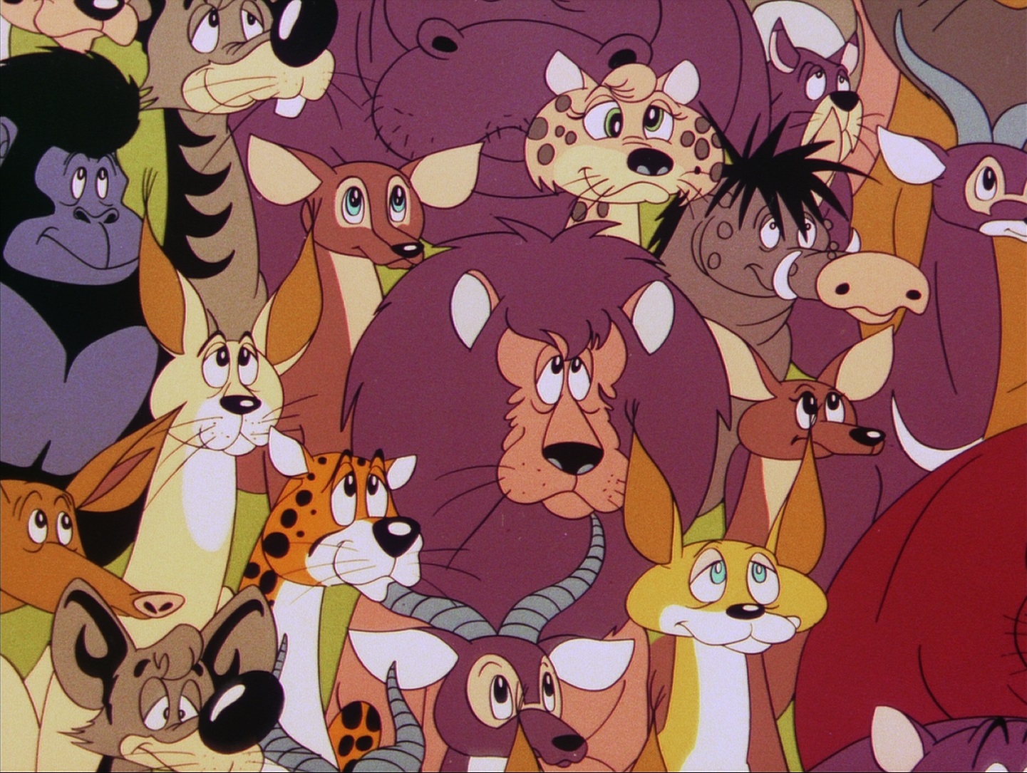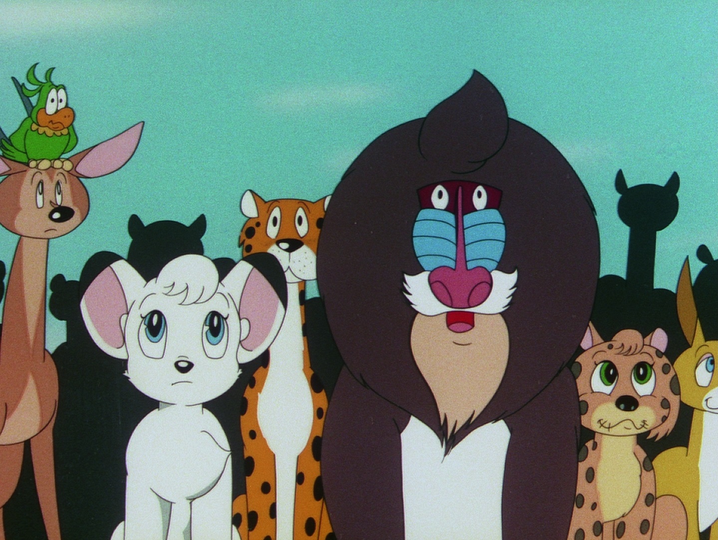 Osamu Tezuka’s unverkennbarer Stil hat einen zeitlosen Charme und der überträgt sich natürlich auch auf die Optik der Anime-Umsetzung. Bei einer Serie aus den Mittsechziger-Jahren darf man natürlich keinen superimposanten, realistischen Stil erwarten. Stattdessen haben wir die typischen großen, runden Augen als DAS Tezuka-Trademark und die eher cartoonigen, am US-Stil orientierten Proportionen. Die Tiere sind natürlich stark anthropomorph, also menschenähnlich, dargestellt. Die Darstellung der Menschen hingegen erinnert stark an Figuren aus der frankobelgischen Comicreihe Tin Tin oder an Popeye. Durch die kräftigen Farben ergibt das einen anachronistischen, aber sehr putzigen Retro-Charme.
