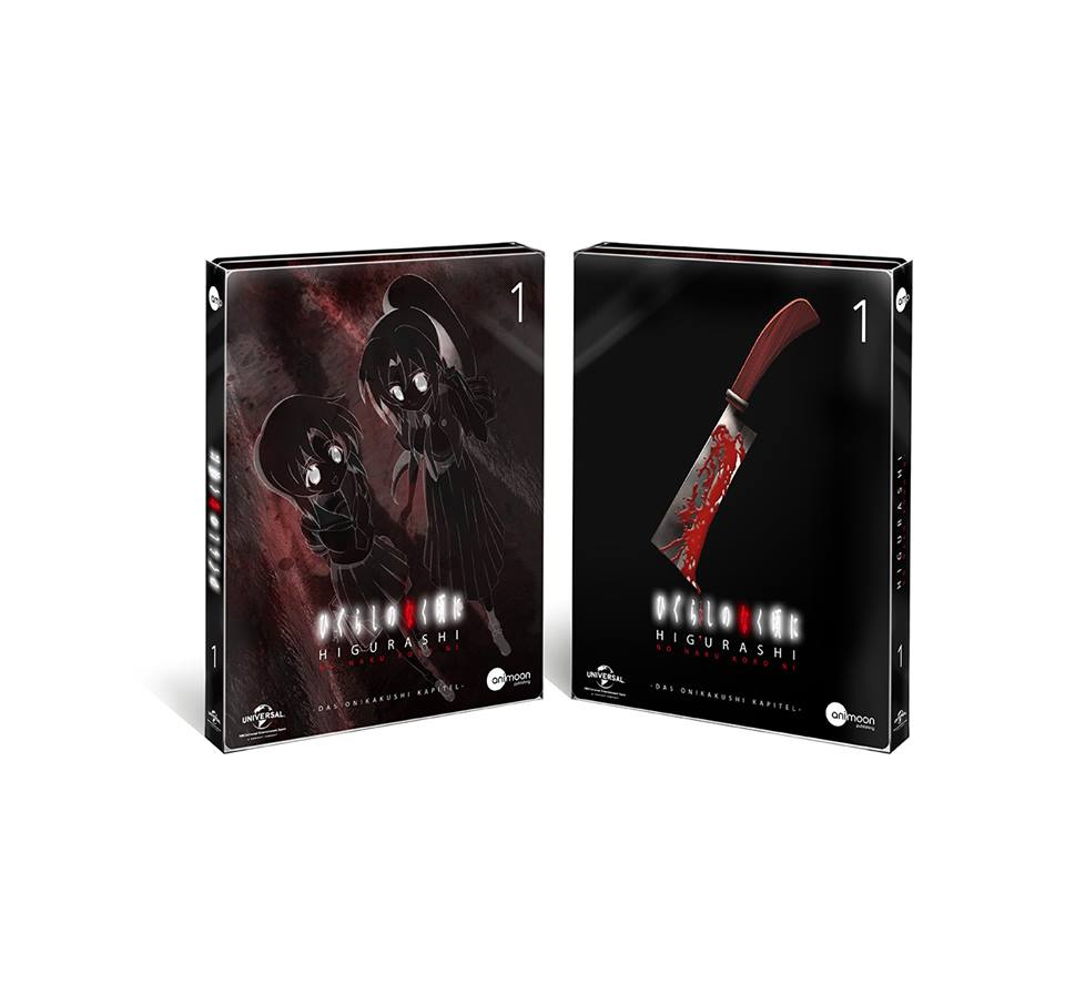 Die Serie wird dabei in Steelcases veröffentlicht, die in PET O-Cards stecken, auf deren Vorderseite Titel, Volumenummer und Publisher verewigt sind (ähnlich wie es bereits bei Toradora! der Fall war). Auf der Rückseite findet sich jedoch diesmal ein farbiges Motiv, welches dem Käufer vielfältige Gestaltungsspielräume ermöglicht, da die PET O-Card sowohl mit der Vorder- als auch mit der Rückseite des Steelcase harmonieren wird. Auf der Rückseite des ersten Steelcases erwartet euch als Motiv die blutverschmierte Machete von Rena Ryuugu. Dem ganzen wird zudem wieder ein Schicker Hartkarton-Sammelschuber beiliegen. Eine Vorbestellung ist aktuell noch nicht möglich, wir halten euch aber natürlich auf dem Laufenden.