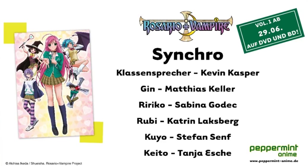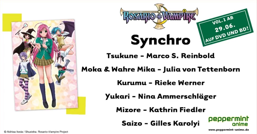In einem Live-Stream enthüllte peppermint anime vor kurzem den deutschen Sprechercast der Animeserie „Rosario + Vampire“ deren Disc-Veröffentlichung in Kürze starten wird.