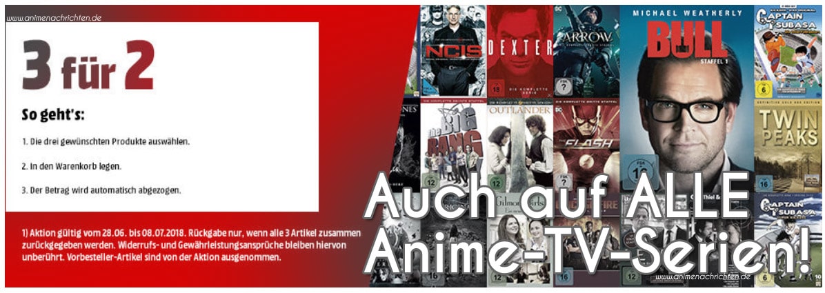 Bei Media Markt habt ihr die Möglichkeit euch 3 Produkte aus dem kompletten Anime-TV-Serien-Sortiment in den Warenkorb zu legen und das günstigste Produkt geschenkt zu bekommen. Der Preis des günstigsten Artikels wird euch automatisch im Warenkorb abgezogen.