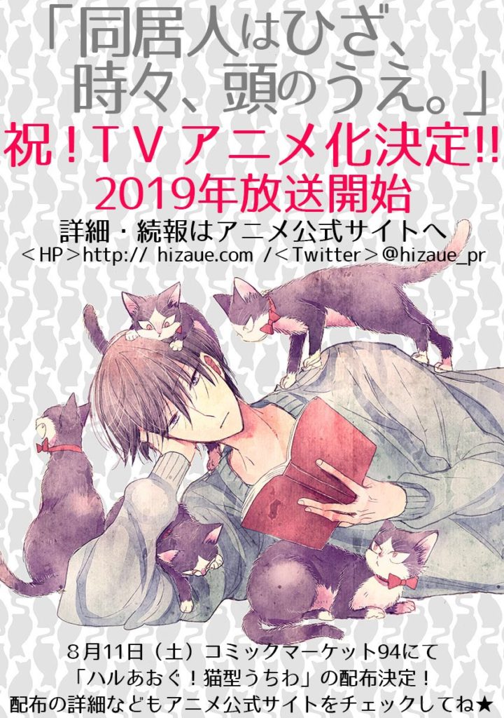 Auf dem Twitter-Account von Flex Comix Inc. wurde nun die Arbeit an einer Animeadaption zur Mangareihe Dōkyonin wa Hiza, Tokidoki, Atama no Ue (engl.: My Housemate Is on My Lap, But Sometimes on My Head) bestätigt.