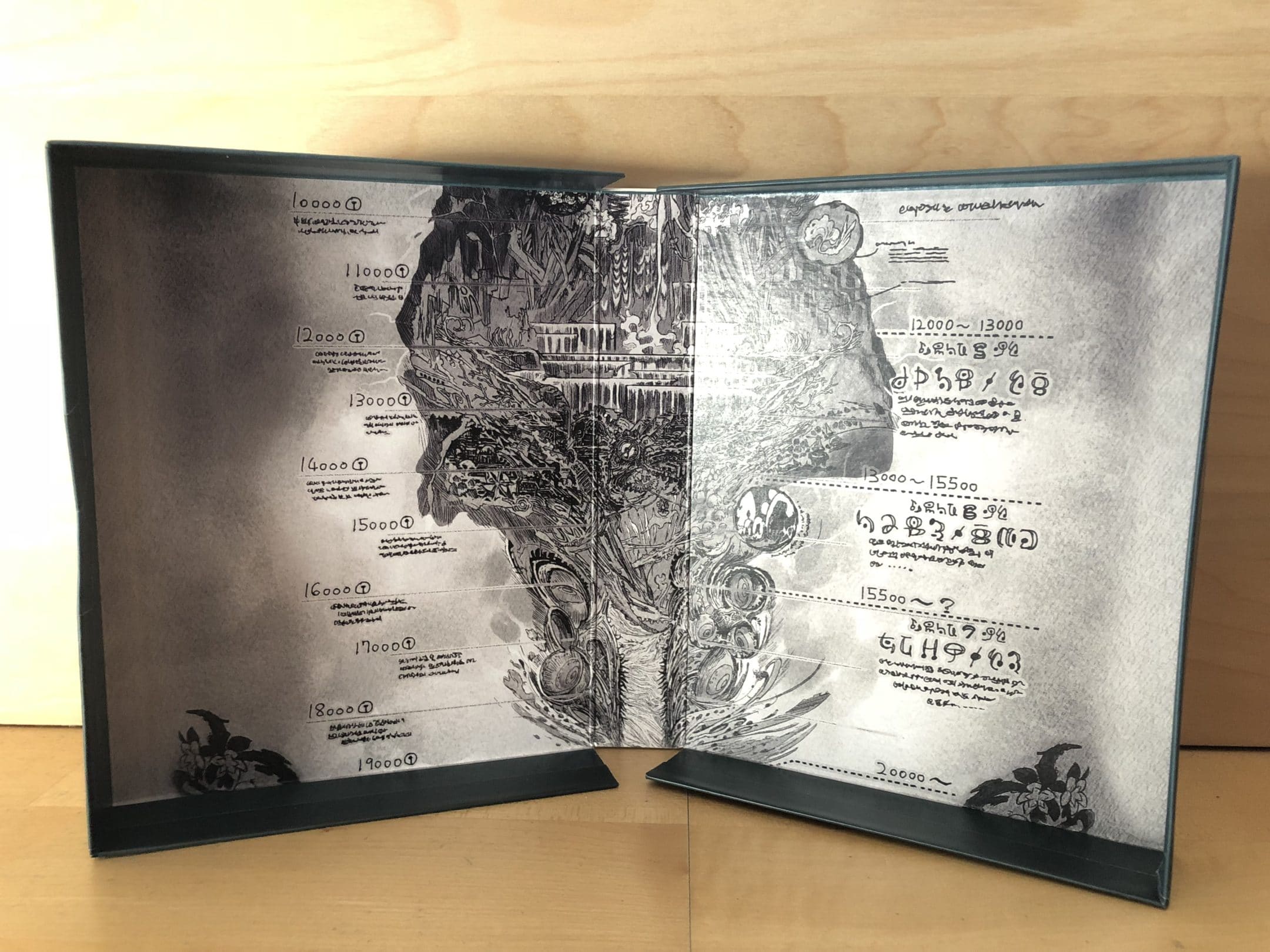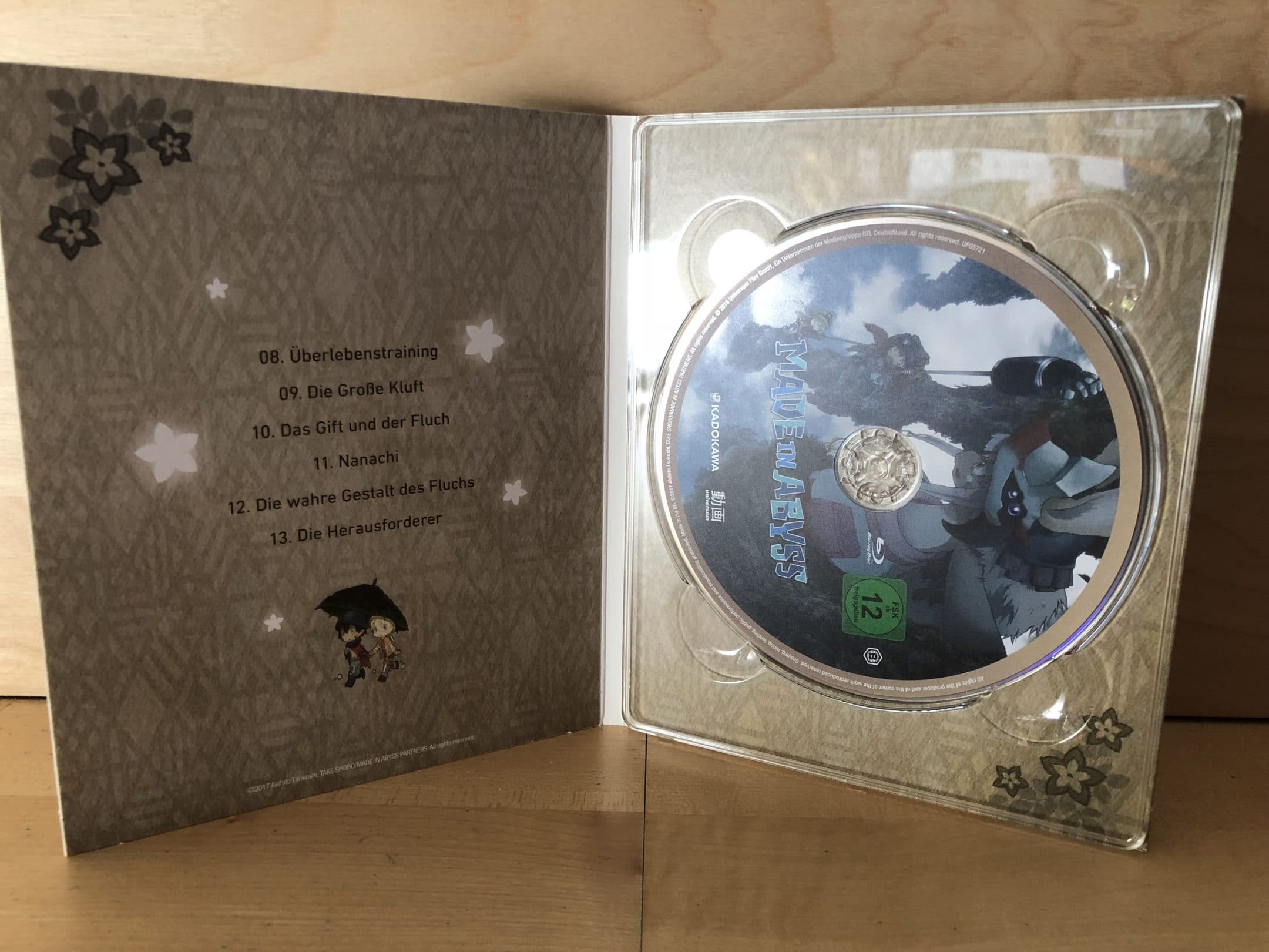 Öffnet man die schicke Klappbox aus Hartkarton, die erneut ohne ein aufgedrucktes FSK-Kennzeichen auskommt, so findet man zunächst vier weitere schicke Postkarten vor. Auch ein Booklet ist wieder mit an Bord. Dieses enthält wieder viele neue Informationen zur Welt von Made in Abyss, aber auch detaillierte Episodenbeschreibungen sowie weitere Interviews, diesmal unter anderem auch mit Mangaka Akihito Tsukushi und den wichtigsten japanischen Synchronsprechern. Davon abgesehen ist auch wieder ein Digipack enthalten, das die eigentliche Disc mit den Episoden 8 bis 13 beinhaltet. Mit Box 2 hat der Käufer dann zudem auch die Karte des Abyss komplettiert, die sich zeigt, sobald man beide Boxen in aufgeklapptem Zustand zusammenlegt.