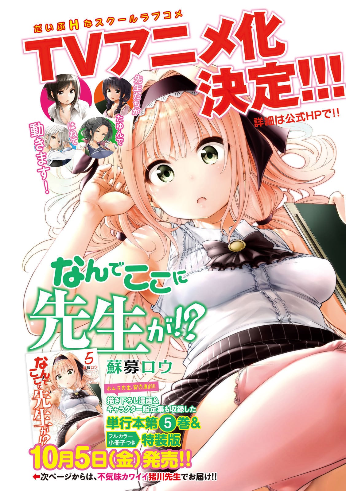 Wie nun in der aktuellen Ausgabe von Kodanshas „Young Magazine“ enthüllt wurde, wird der Manga „Why the hell are you here, Teacher!?“ (jap. Nande Koko ni Sensei ga!?) von Soborou eine TV-Anime-Adaption erhalten. Nähere Informationen sind zum aktuellen Zeitpunkt noch nicht bekannt.