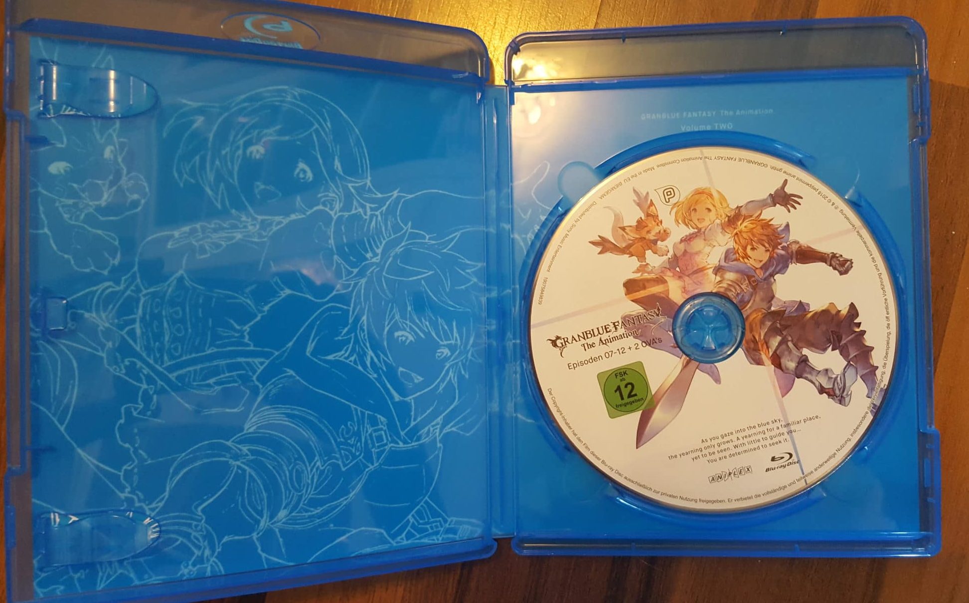 Der Anime kommt in einer Standard Amaray-Hülle, die im eigenen Pappschuber steckt, daher. Leider ist diese Art von Schuber gewohnt instabil und muss daher mit der nötigen Vorsicht behandelt werden, um Beschädigungen zu vermeiden. Als Illustrationsmotiv für den Schuber wurden Gran und Djeeta ausgewählt. Das FSK-Logo ist natürlich wieder nur aufgeklebt und lässt sich gut ohne Rückstände oder Beschädigungen entfernen.