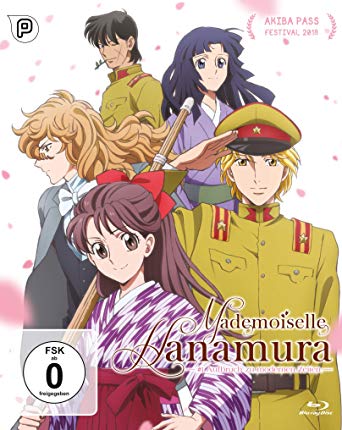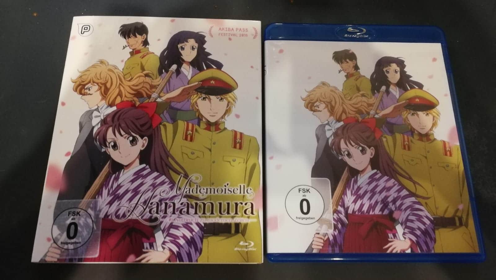 Wie für Peppermint Anime nicht unüblich kommt Mademoiselle Hanamura in eine Standard Amaray-Hülle daher, die in einem nach oben und unten hin geöffneten Pappschuber, auch O-Card genannt, steckt. Leider ist dieser Schuber nicht besonders stabil, weshalb er sehr vorsichtig zu behandeln ist, um ihn nicht zu beschädigen. Positiv lässt sich jedoch anmerken, dass das USK-Logo auf dem Schuber nur aufgeklebt ist und sich mit wenig Mühe und ohne Rückstände entfernen lässt. Auf dem Schuber, wie auch der Amaray-Hülle, sind Illustrationen der Protagonistin Benio, Shinobu, Ranmaru, Tosei, dem Chef-Redakteur der Zeitung für die Shinobu später arbeitet, und Shingo, Shinobus Armee-Freund an der Front.