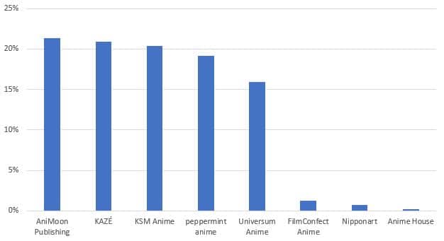 Gewinner des AnimeNachrichten Leser-Award 2018 ist AniMoon Publishing, die diesmal insgesamt 21,4% aller Stimmen auf sich vereinen konnten! Insgesamt war das Rennen um die ersten Plätze aber extrem knapp. Den zweiten Platz belegte diesmal KAZÉ mit 20,9% aller abgegebenen Stimmen, während sich KSM Anime mit 20,4% der Stimmen den dritten Platz sichern konnte. Die weiteren Platzierungen und Ergebnisse könnt ihr der Grafik entnehmen: