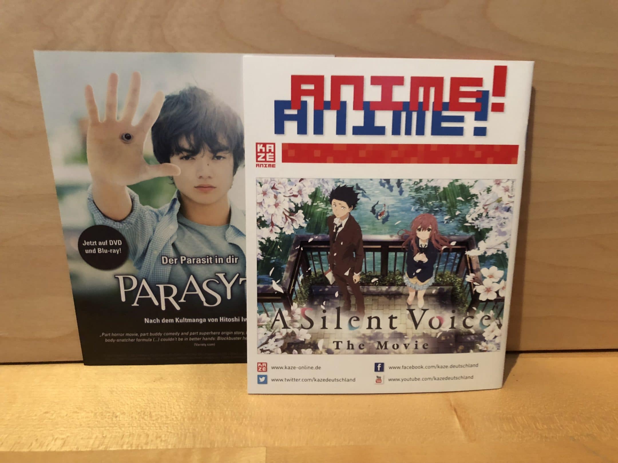 Im Pappplatzhalter, der sich ebenfalls im Sammelschuber befindet, findet ihr als weiteres Extra ein Brillenputztuch im Stil der Serie vor. Öffnet man das Digipack, so kommt dort ein Werbeflyer zum Vorschein, auf dem man die Live-Action Verfilmungen von „Parasyte“ anpreist. Gleichzeitig findet sich dort ein kleines Heft, das euch einen kleinen Überblick über das aktuelle Programm von KAZÉ vermittelt. Auf der Disc selbst befinden sich neben den ersten sechs Episoden der Serie auch das Clean-Opening sowie ein Trailer zu „Brynhildr in the Darkness“ als digitale Extras.