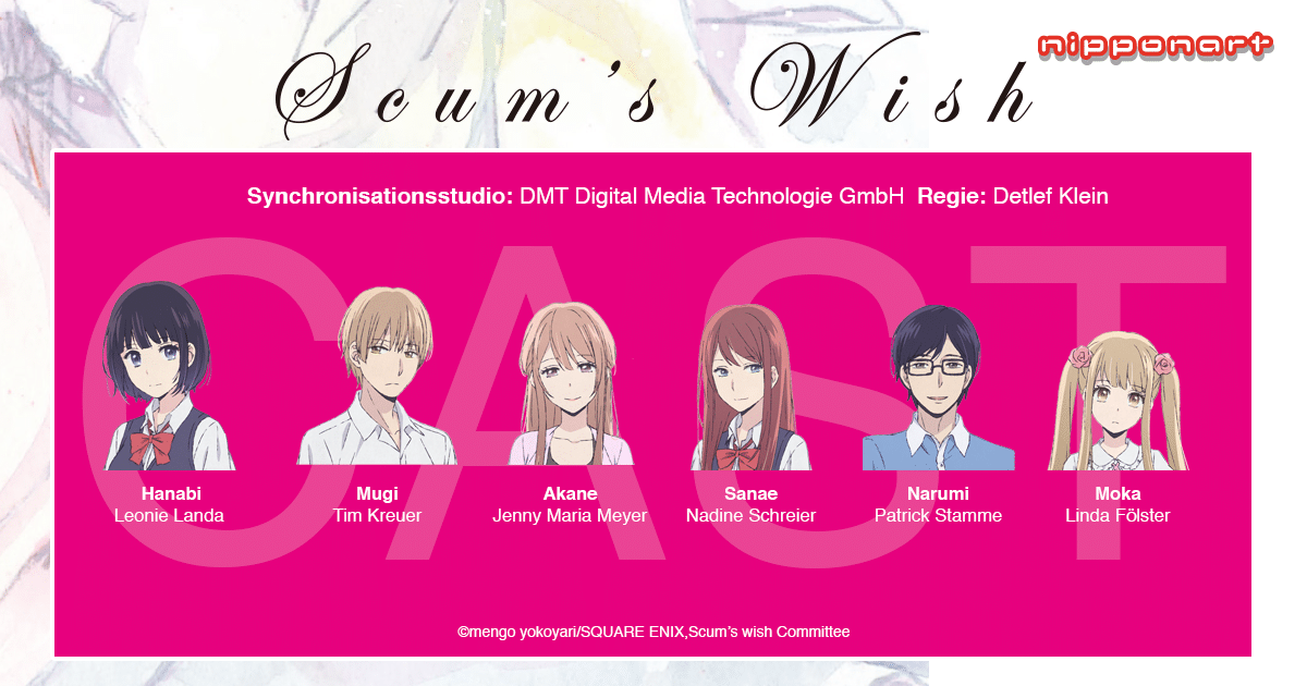 Ein kleinig wenig müsst ihr euch noch gedulden, bis das erste Volume der Animeserie „Scum’s Wish“ im deutschen Handel erscheint, doch bereits heute enthüllte Publisher Nipponart die an der Vertonung beteiligten deutschen Sprecher.