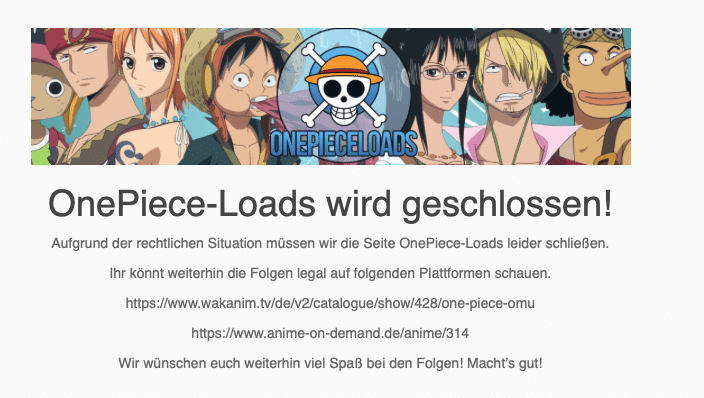 Wie nun kürzlich bekannt wurde, wurde die deutsche illegale Stream- und Download-Webseite „OnePiece-Loads“ vom Netz genommen.