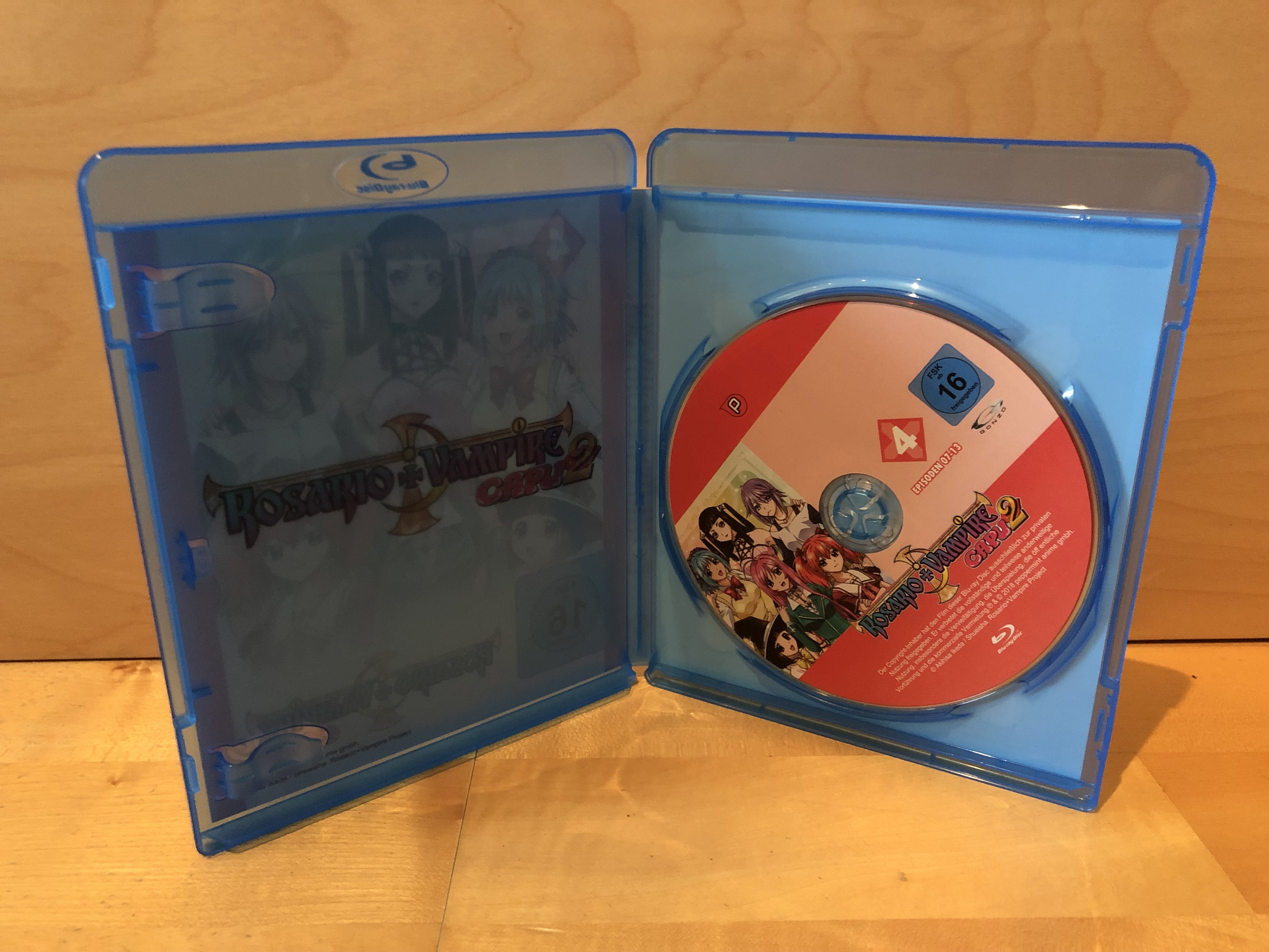 Im Inneren der Amaray-Hülle bietet sich das gewohnte Bild, denn auch beim finalen vierten Volume von „Rosario + Vampire“ hat man auf physische Extras verzichtet. Daher findet sich hier nur die Disc mit den Episoden 20 bis 26, die als digitale Extras allerdings noch einige Trailer zu weiteren Veröffentlichungen von peppermint anime enthält. Gleichzeitig sind das Clean Opening und Clean Ending mit an Bord.