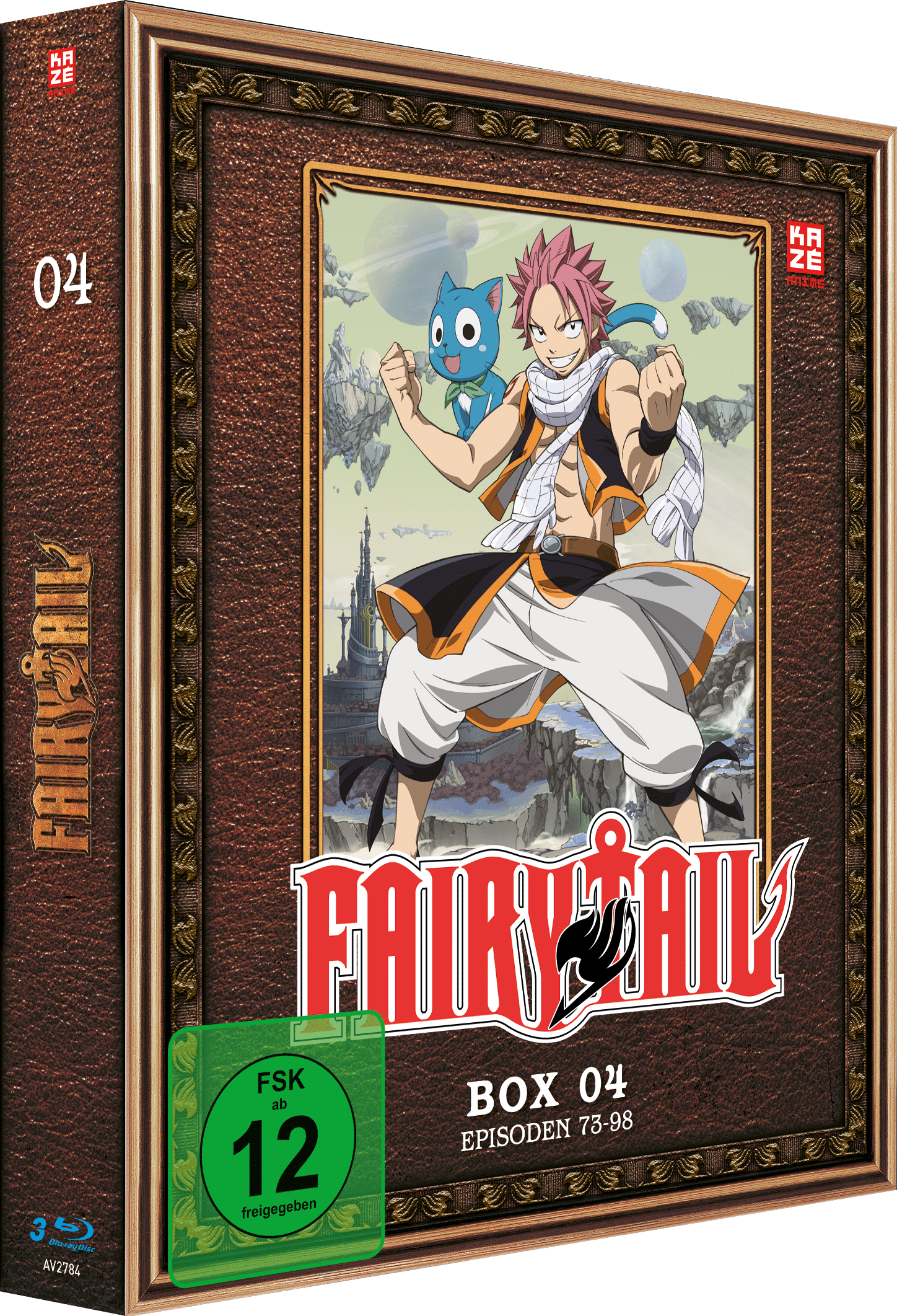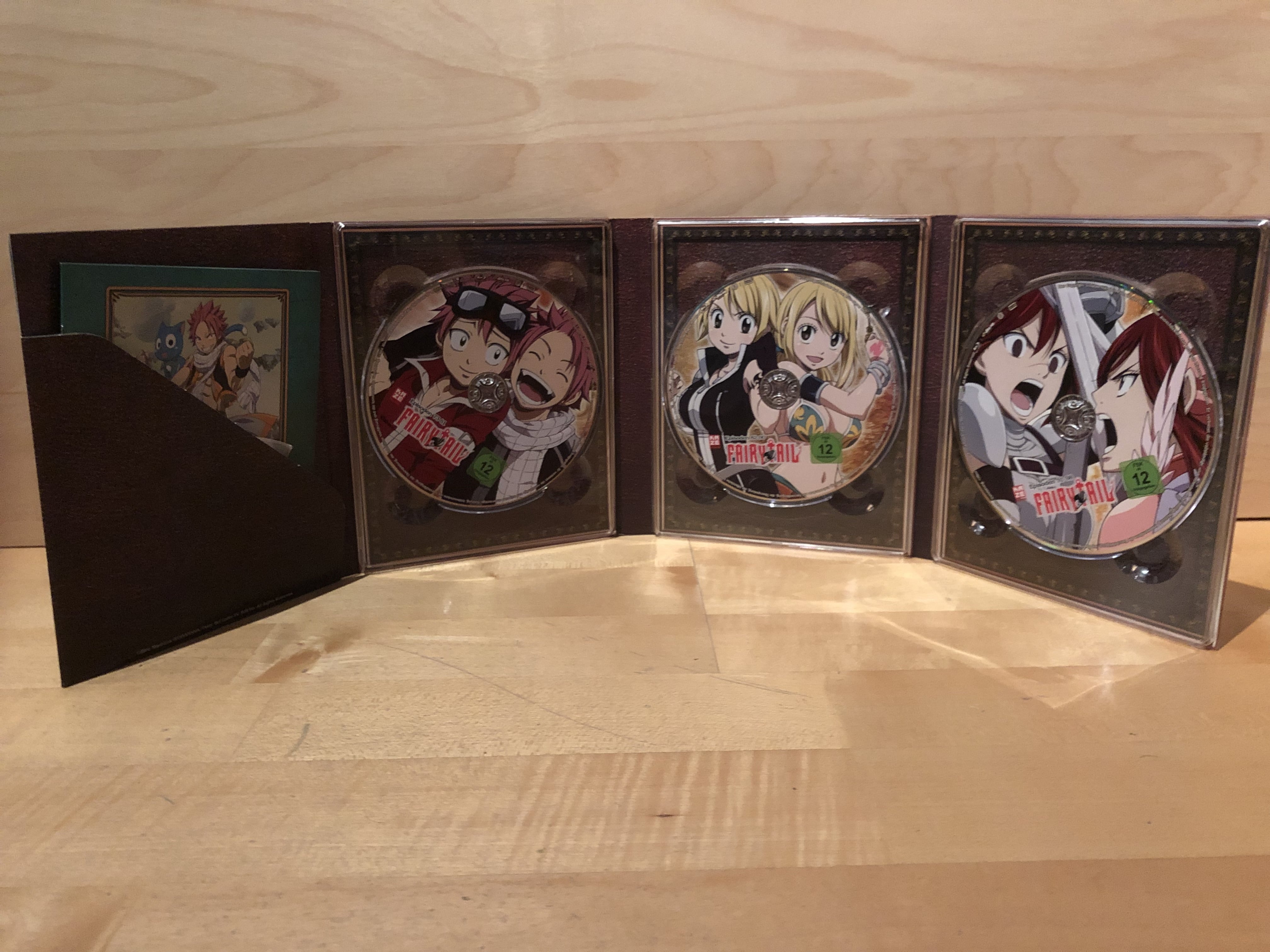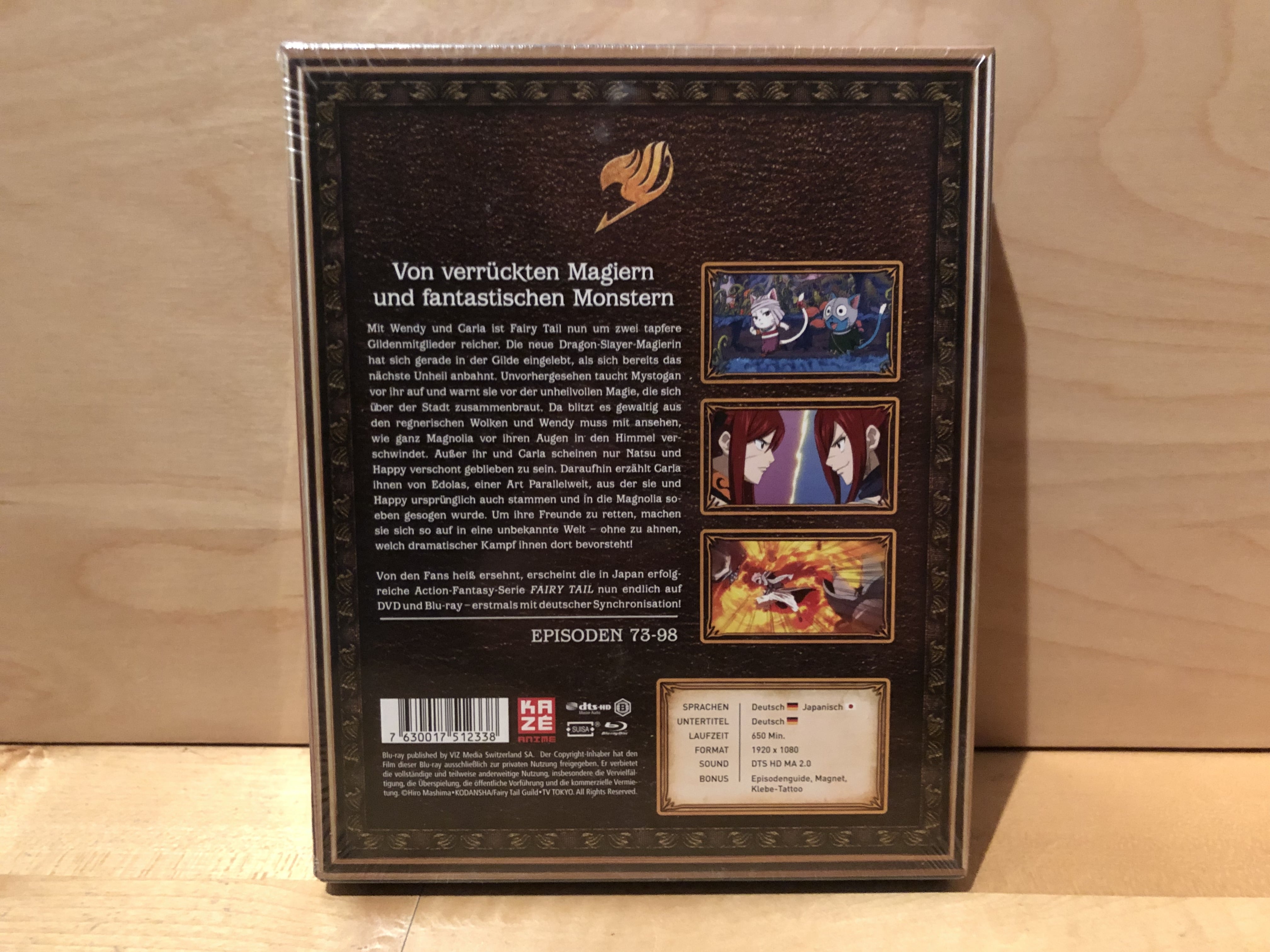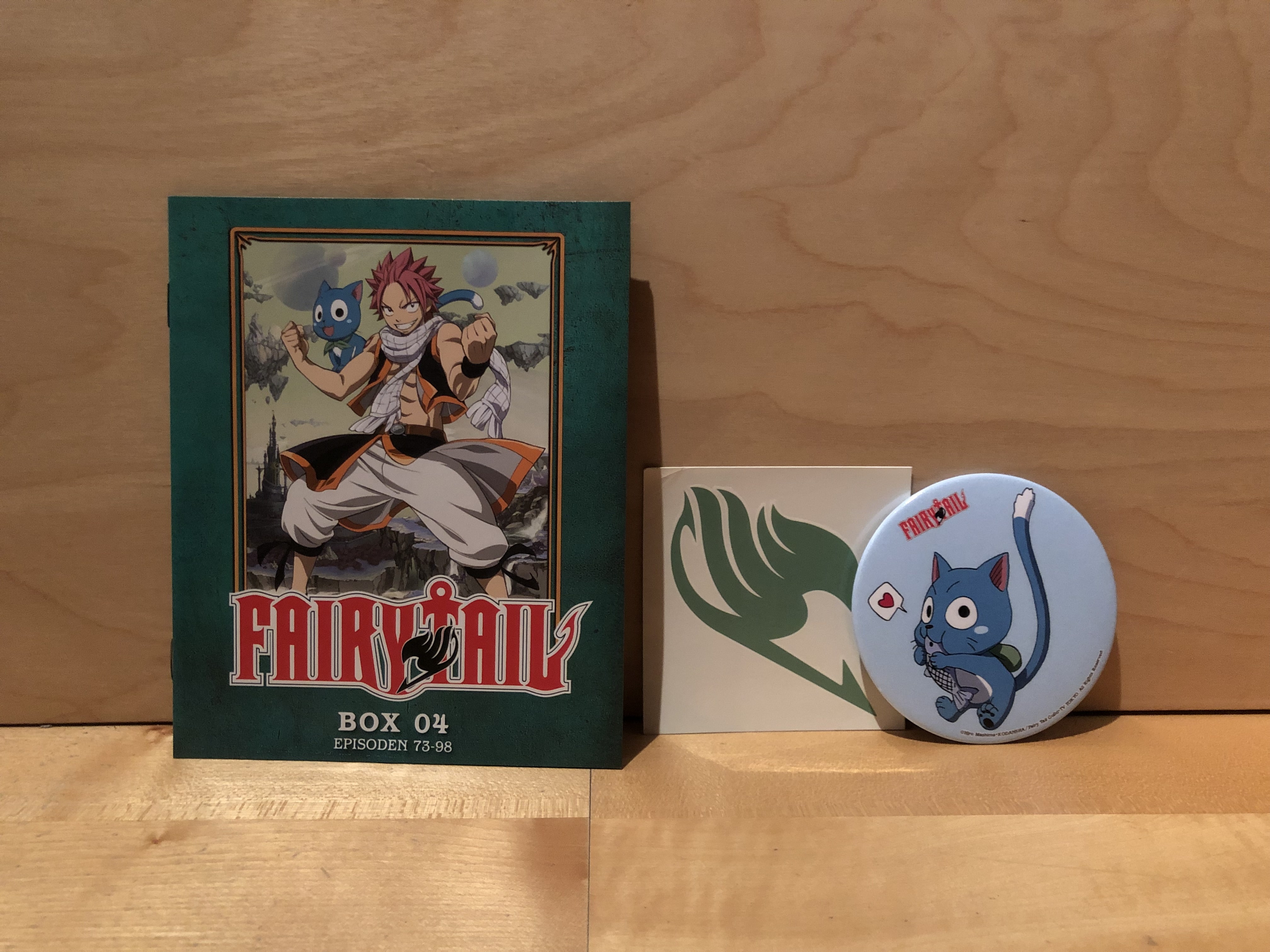 Im Inneren des Digipacks finden sich wieder drei Blu-Ray-Discs, die diesmal die Episoden 73 bis 98 der Serie umfassen. Auch ein Booklet, das erneut als Episodenguide dient, ist wieder mit an Bord. Zudem dürfen sich Käufer auf ein weiteres Fairy Tail Klebe-Tattoo sowie einen weiteren Magneten freuen. Auf Letzterem ist diesmal Happy abgebildet.