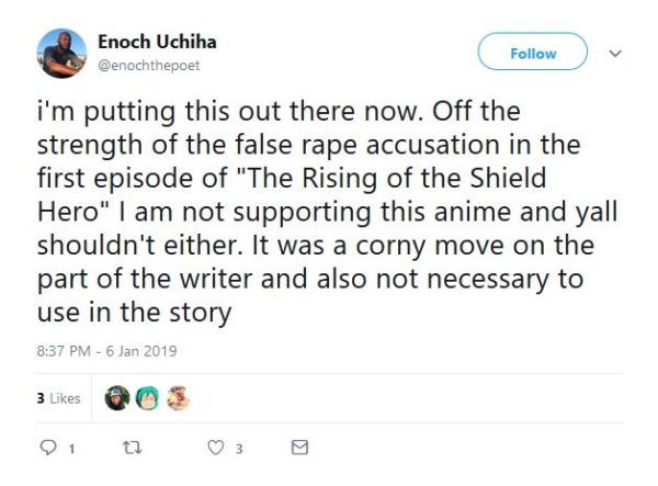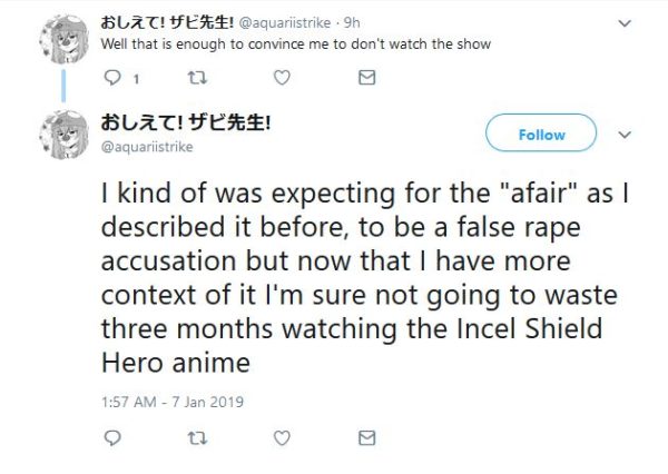 In dieser ganzen Kontroverse kommen vor allem die Redakteure der Nachrichtenseiten ,,Anime News Network“ und „S1e1“mit ihren Reviews ins Kreuzfeuer. Demnach behaupten sowohl Nick Creamer (ANN) als auch Jessi Silver (S1e1), dass eine vorgetäuschte Vergewaltigung nicht im realen Leben passieren könnte. Denn in einem Live-Tweet behauptete ersterer, dass die ,,ganze Handlung auf einer falschen Vergewaltigung beruht, die jeder sofort glaubt, etwas, das im wirklichen Leben praktisch nie passiert und das nur eine Epidemie in den Köpfen paranoider Misogynen ist.“